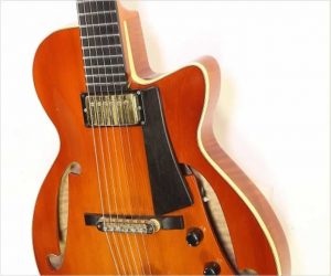 This Harrison GB Spruce top thinline archtop electric in a lovely Amber tint, built during 2008 at Harrison’s shop in Toronto, Canada. The Douglas Harrison GB thinline archtop guitar has proven very popular with jazz guitarists. Designed with – and originally for – the late Gary Benson and built in Toronto, Ontario, the Harrison GB uses a carved solid spruce top on a chambered back. The neck has a compound radius, from 12 to 16 inches.