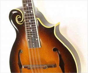 The Gibson F12 mandolin was built for two periods – from 1934 to 1937, and from 1948 to 1980. This example is one of 85 built during 1949. Gibson mandolins broke new ground when Orville Gibson combined traditional Mandolin and Violin designs in the closing years of the 19th century. To this point, mandolins mostly followed the European style with a bowl back and flat, folded top.