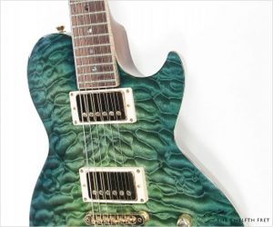This is a Brian Moore DC/1P Custom Shop with a fabulous quilted top and Sea Foam Green finish, built during 2001 in LaGrange, New York. Based on the classic single-cut design, the Brian Moore DC/1P features a carved, Quilted Maple cap on a Mahogany body, a Mahogany set neck, Indian Rosewood fingerboard with custom Mother of Pearl inlays, Maple bindings, Quilted Maple head plate and gold plated hardware.