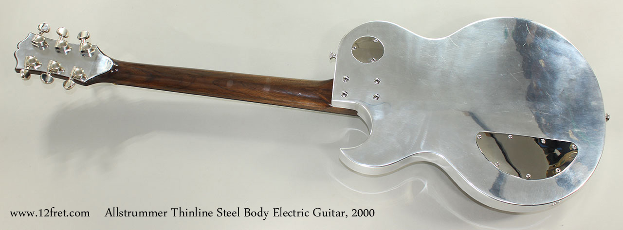 This design is clearly influenced by efforts like those of James Trussart, but does not have the finish effects Trussart is well known for. It has an aluminum body, with a shape rather like an ES-137, with a walnut neck and rosewood fingerboard (possibly Brazilian), brass nut and abalone dot position markers. On the rear of the head, there’s an extra metal plate. Long ago, there was a plate like this commercially available under the name ‘Fathead’, intended to increase sustain and brightness. The tuners are Grover Roto-Matics, the pickups are Lollar humbuckers. The controls use a standard wiring layout. A leather gig bag is included.