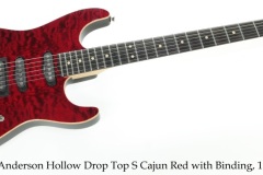 Here we’re looking at an Anderson Hollow Drop Top S, with a faux-bound figured Maple top; instead of the binding being separate pieces, the finish is scraped back for a visual simulation. The finish is called ‘Cajun Red’, with the back receiving an opaque black finish. The neck is Maple with a dark Madagascar Rosewood fingerboard and