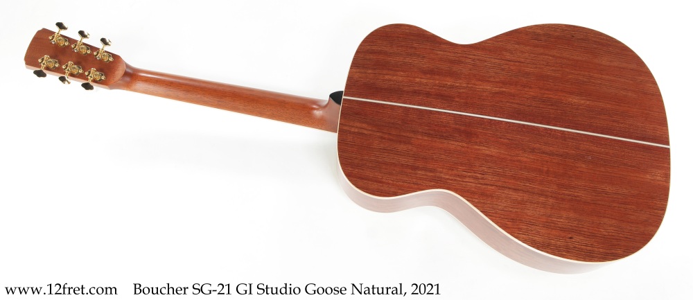 The Boucher SG-21 GI is an OM Hybrid model using a torrefied Adirondack Spruce top and African Bubinga for the sides and back. The GI letters indicate the ‘Gold’ and ‘Intimate Concert’ options were specified. The Gold options include a Torrefied ‘Gold Touch’ top and gold-plated Gotoh open-gear tuners. The ‘Intimate Concert’ pack provides a passive three-element K&K Pure Mini pickup set installed to the bridge plate and an end-pin jack.