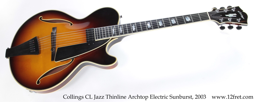 This is a very early Collings CL Jazz, built around 2003. It features a single-cut thinline body with hand carved arched top and back; the top is European Spruce with bound F-holes, with sides, back and neck of Honduran Mahogany. The bound head plate, fingerboard, pickguard, floating bridge, truss rod cover and tailpiece front are all Ebony. The distinctive and unique position markers and Collings logo are Mother of Pearl, the nut is Bone, and the headstock uses the Collings ‘Haircut’ profile.