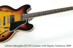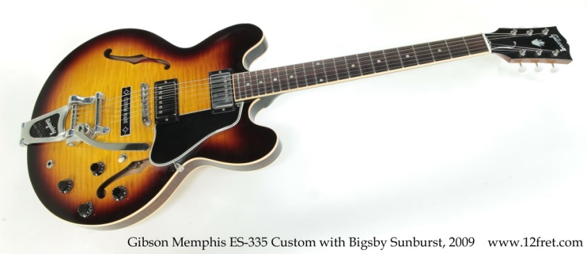 Following the usual pattern, this Gibson Memphis ES-335 Custom uses highly figured, laminated Maple for the top, back and sides, with a Maple center block to reduce feedback. Mahogany is used for the linings and neck, which has a bound Indian Rosewood fingerboard with dot position markers. Originally fitted with Grover Roto-Matics, a set of physically lighter Gotoh vintage Kluson style tuners with creme plastic buttons were professionally installed; the Roto-Matics are in the case. The Bigsby B7 is stock, and a ‘CUSTOM MADE’ plate is fitted over the space where the stop tailpiece would be.