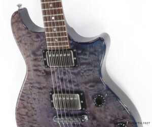It’s rare to see one of these available for sale – a Terry McInturff Taurus in Translucent Blue finish on an AA Quilted Maple top. Based on the serial number, this guitar entered the finish booth during September 2000. The McInturff Taurus is a single-cutaway solidbody electric using the proven formula of a Maple cap on a Mahogany body, with Mahogany for the neck and Indian Rosewood for the unbound fingerboard. On the Taurus, the Maple cap is highly figured, AA Quilted Maple.