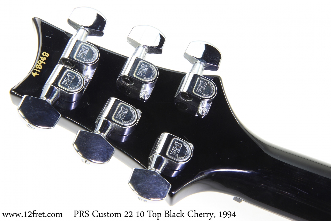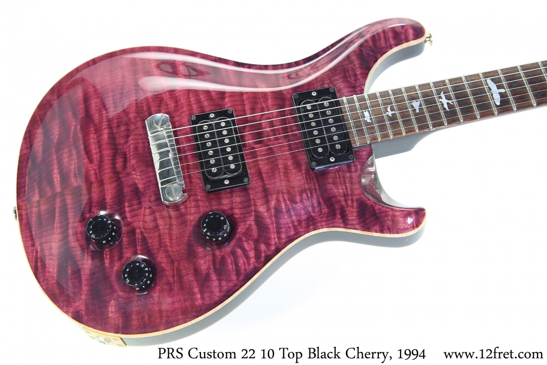 The PRS Custom 22 10 Top is a spectacular guitar in any finish, and the Black Cherry stain on this 1994 example is stunning. The Custom 22 was first based on the PRS Dragon, but without the fancier inlay or trem. In 2015, the stoptail bridge was discontinued and the trem bridge took its place.