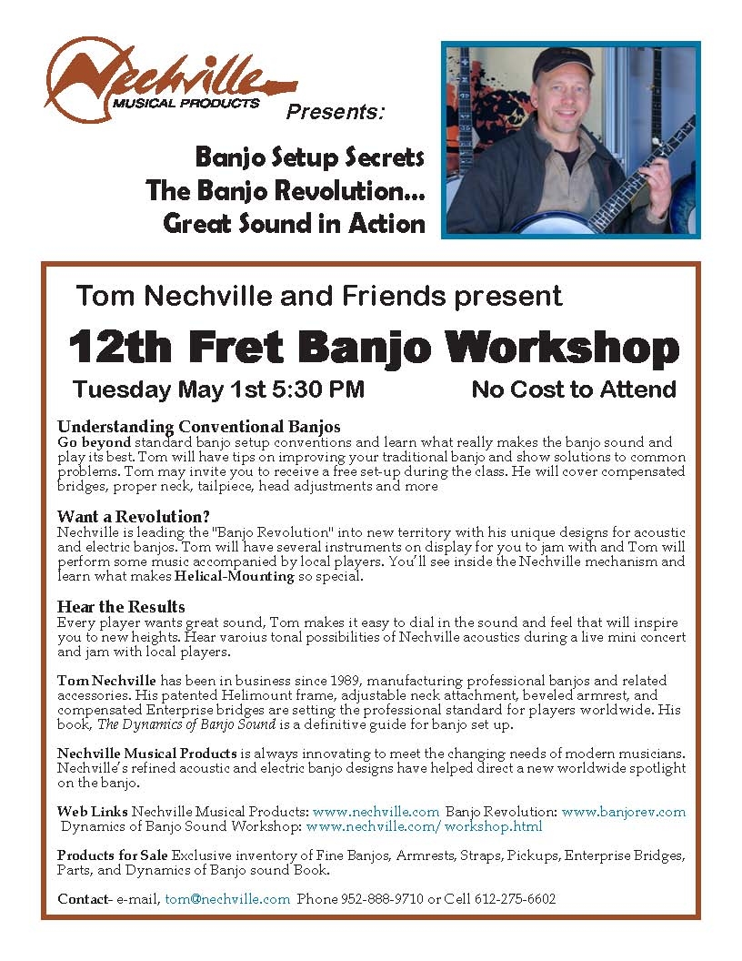 Bring your banjos…all of them…for Tom’s free adjustments and setup advice.