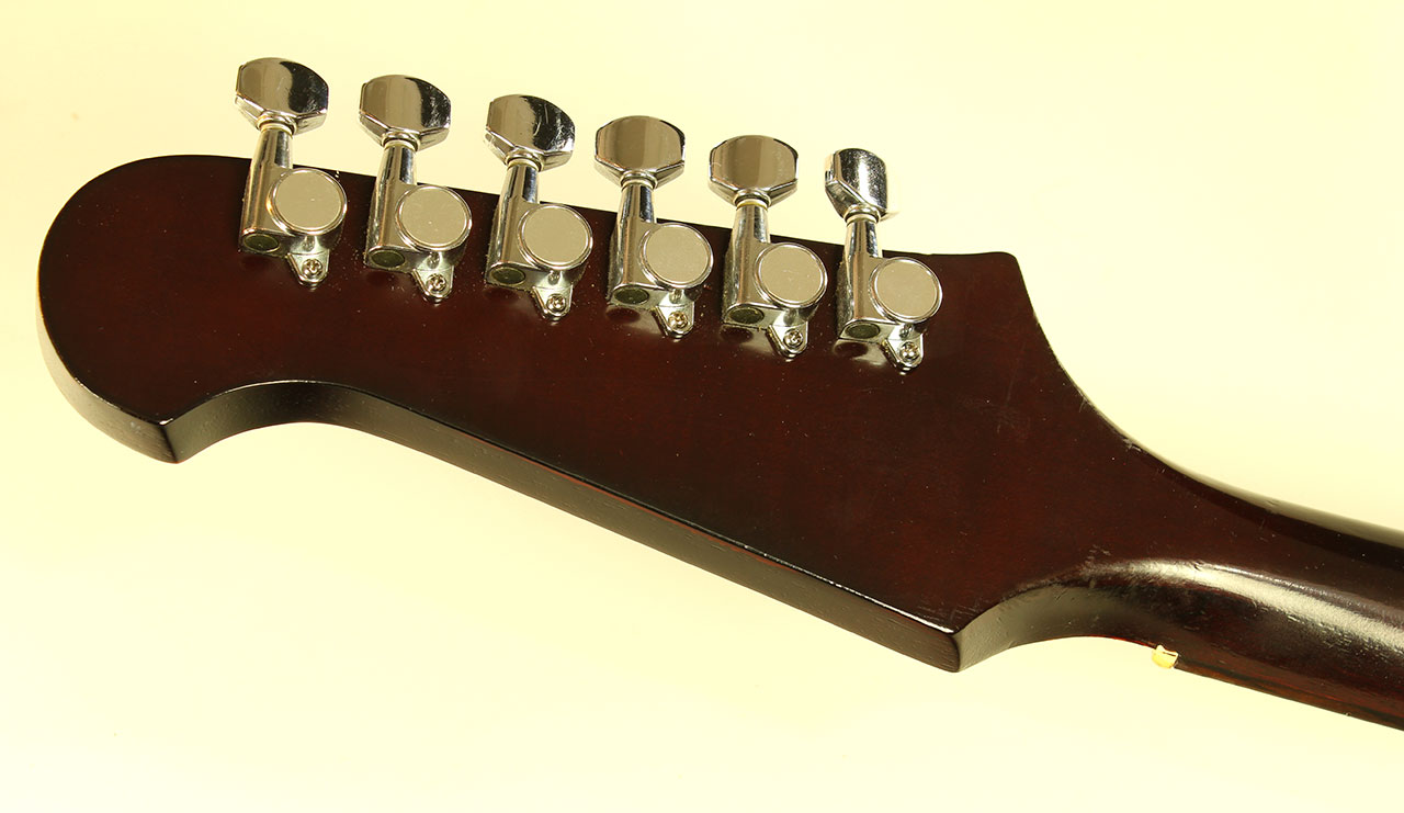 | Comments | Gibson started producing the Firebird in 1963 (as the ‘reverse’ models), but by 1965 sales weren’t being made and Fender was suing for copyright infringement, so the guitar was basically flipped, producing these ‘non-reverse’ models, and these were produced until 1969 when the line was discontinued. The Reverse models used a neck-though design, while the non-reverse feature a set-in neck.This Firebird I has two P-90’s and a factory stop-bar-and vibrola combination. The vibrola itself works quite well; these units are really nothing like the Stratocaster bridge, but are much more like a Bigsby in terms of pitch change. |