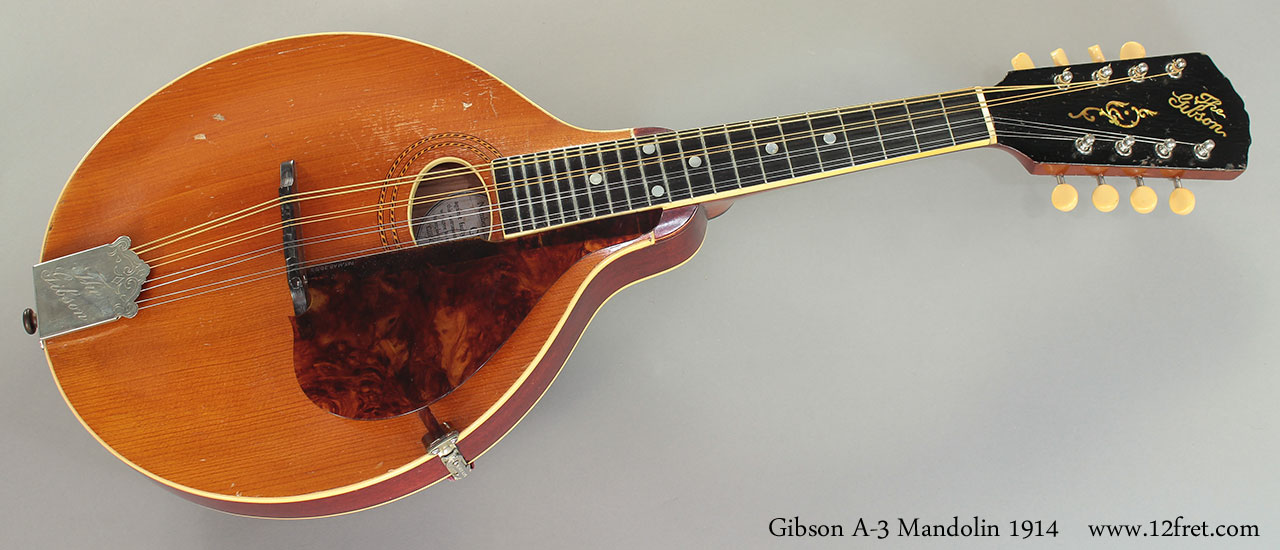 1914 Gibson A-3 Mandolin, all original with original case. Carved Spruce top, mahogany for the sides, carved back, and neck. Ebony fingerboard and bridge, original and celluloid faux tortoise pickguard, nickel bracket and tailpiece.