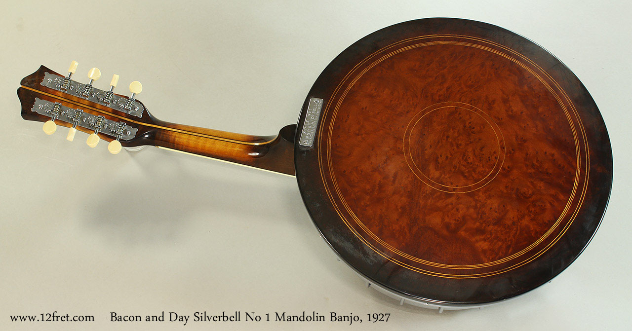 This beautiful piece is a complete restoration of 1927's top of the line Bacon and Day Silverbell No.1 Mandolin Banjo. All the metal parts have been cleaned and replated and the wooden parts refinished. The rim and neck are maple, and the resonator uses burl walnut, and the restoration has been very well done. The scale length is 13.75 inches and the nut wiudth is 1.25 inches (32mm).