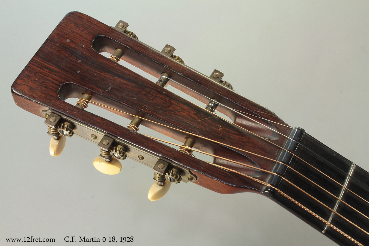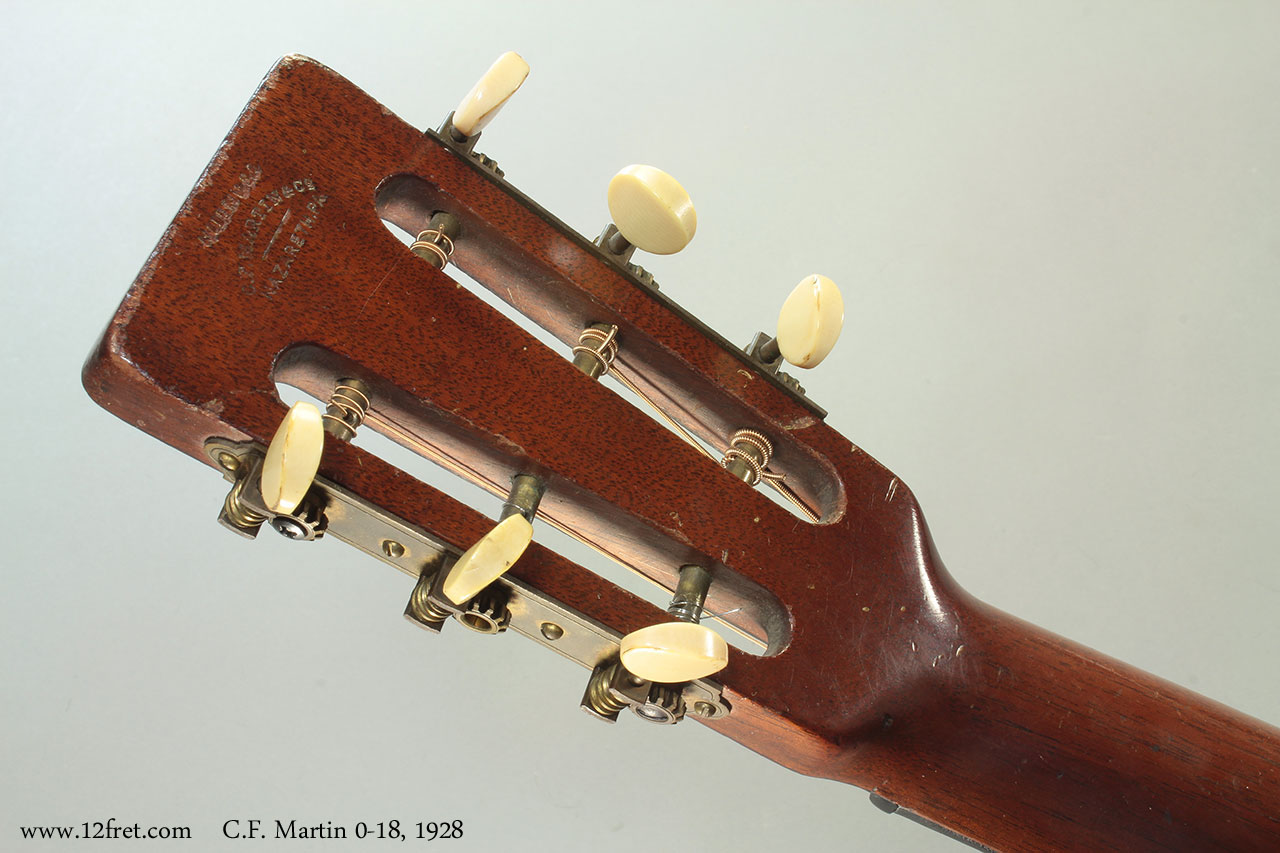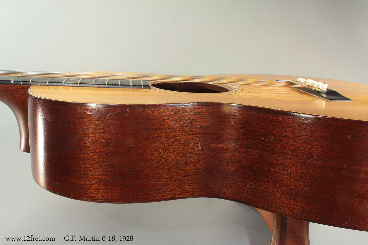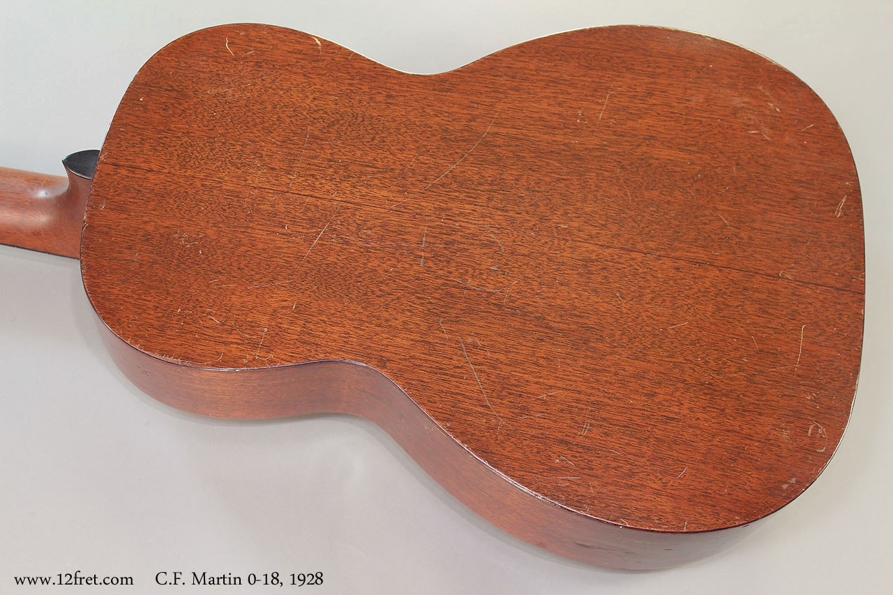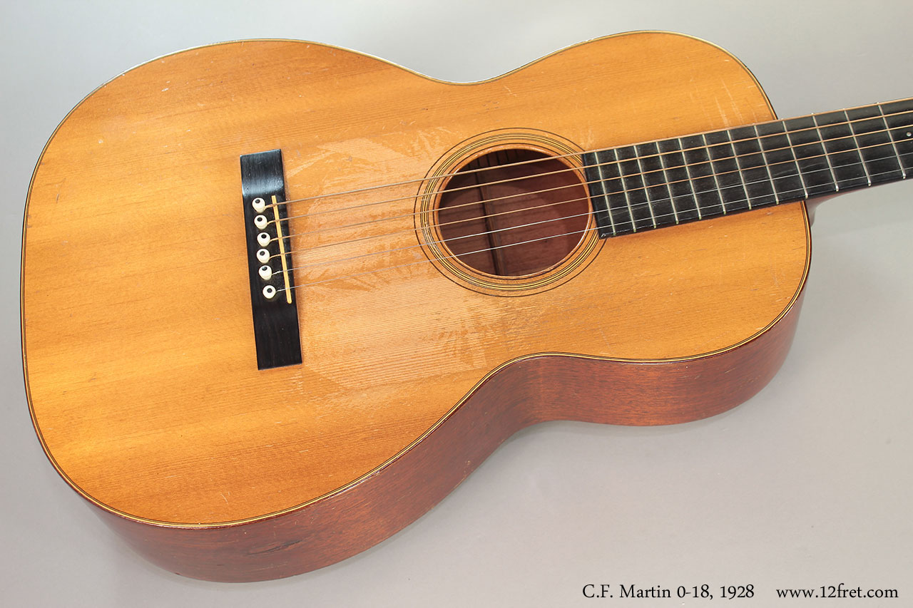 C.F. Martin 0-18. Natural finish, spruce top, mahogany back, sides and neck, ebony fingerboard. 12-fret slot head neck and bar frets. Non-original ebony bridge, tap plate removed showing top wear. Side repairs and overspray done long in the past. Newer TKL case included.