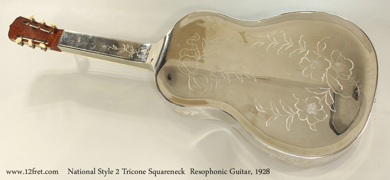 The National String Instrument Corporation was founded in 1927 by John Dopyera and George Duchamp, to provide the loudest string instruments available. Even then, there were volume wars between guitars and the others on the stage - at that time, banjos and mandolins. The original design and all the earliest instruments were tricone models, and many carried this German Silver finish with fancy engraving.