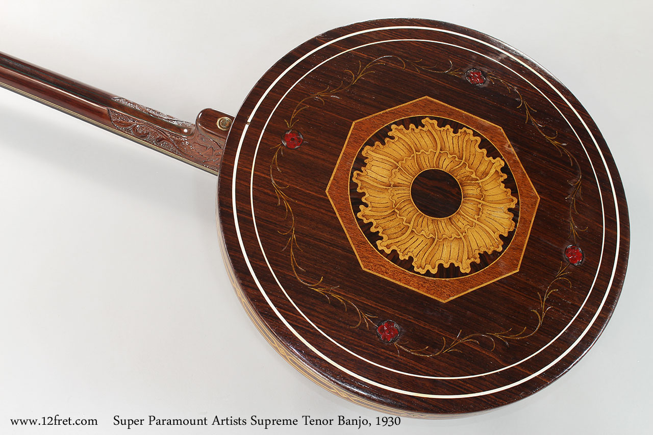 The most elaborate of the Super Paramount line was the Artists Supreme, with engraved inlays on the head and fingerboard, marquetry on the resonator, and an engraved celluloid sidewall. It is a spectacular instrument.