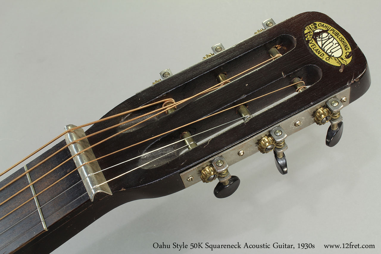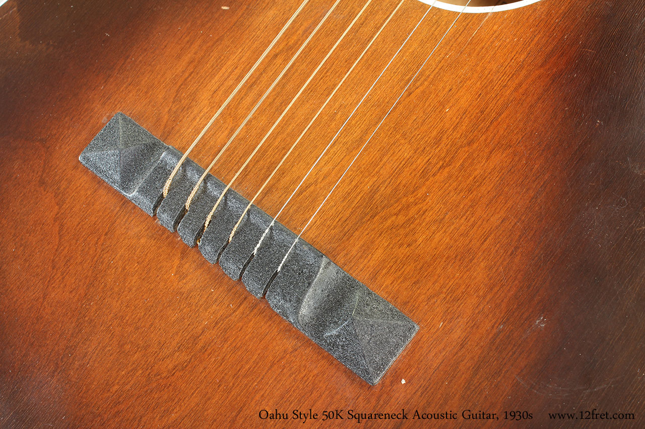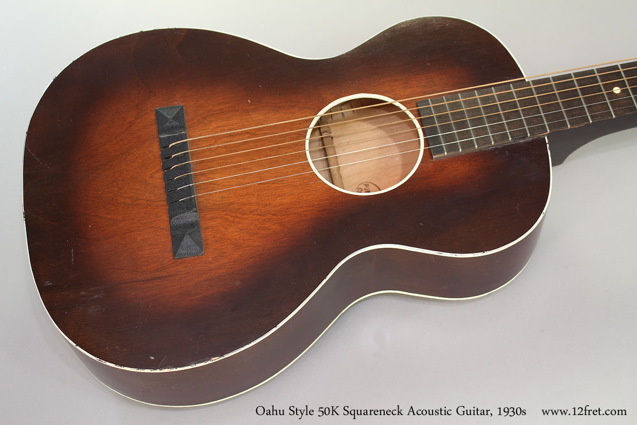 This is a 1930s Oahu Style 50K acoustic guitar, with a square neck and a metal nut riser showing that it was intended to be played lap-style as a Hawaiian guitar. At this point, steel guitar was almost exclusively Hawaiian; Blues and country slide styles barely existed. The top, back and sides are likely birch laminate, with poplar for the neck. The metal pyramid bridge is characteristic of Oahu student model guitars, and is bolted to the top.