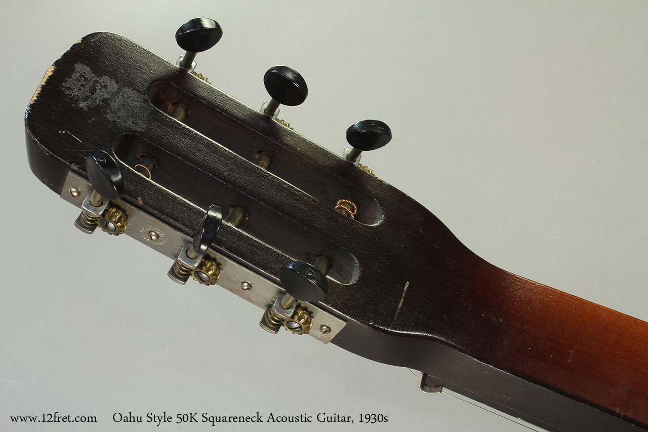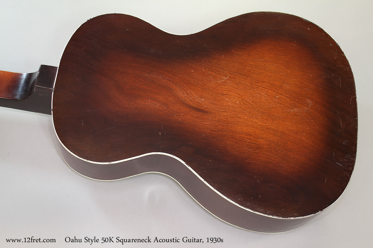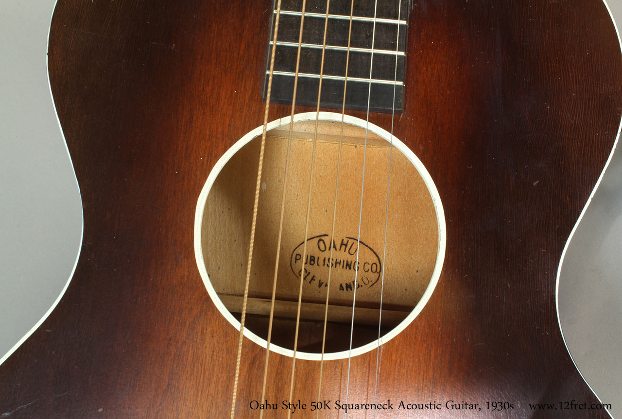 This is a 1930s Oahu Style 50K acoustic guitar, with a square neck and a metal nut riser showing that it was intended to be played lap-style as a Hawaiian guitar. At this point, steel guitar was almost exclusively Hawaiian; Blues and country slide styles barely existed. The top, back and sides are likely birch laminate, with poplar for the neck. The metal pyramid bridge is characteristic of Oahu student model guitars, and is bolted to the top.