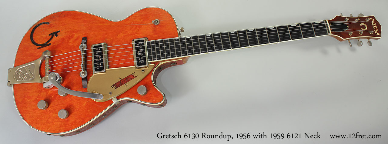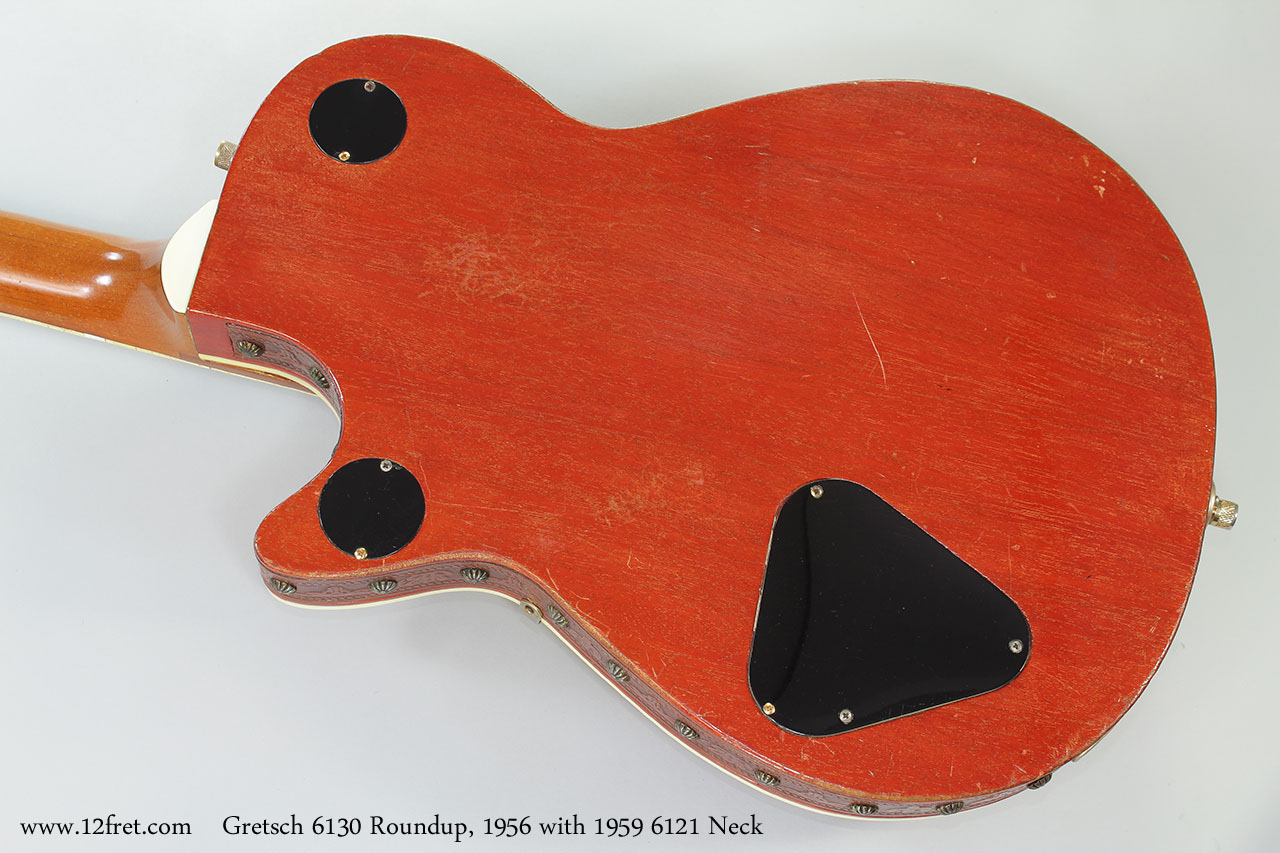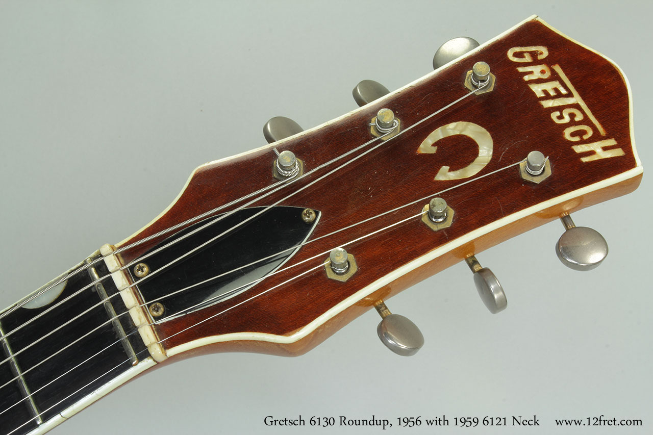 We conclude that somewhere, decades ago, two damaged guitars were merged into one working unit. The neck, pickguard, bridge and Bigsby tailpiece were moved from a 1959 Chet Atkins 6121 and mounted onto a 1956 6130 Roundup. The neck was refinished gloss.