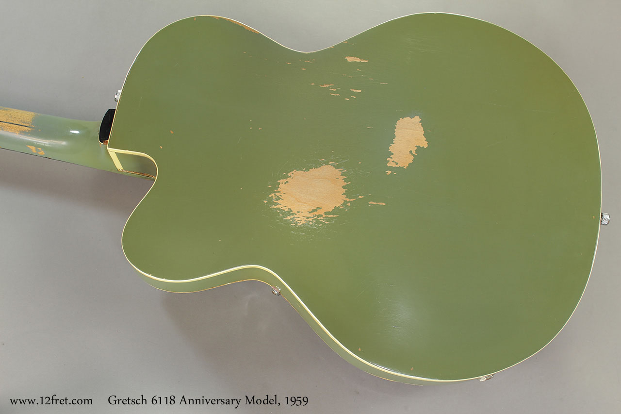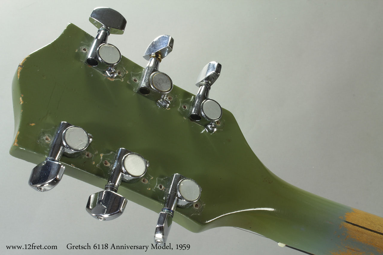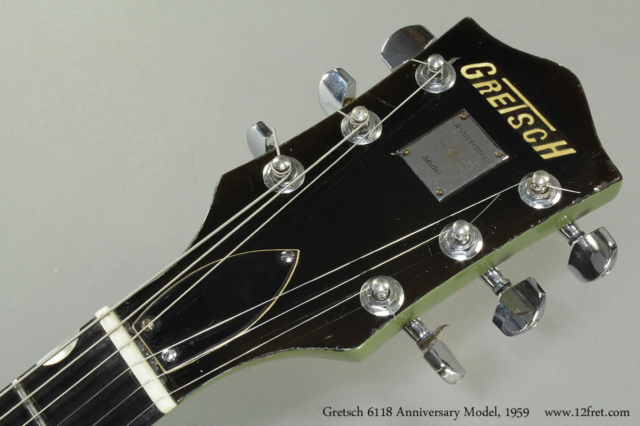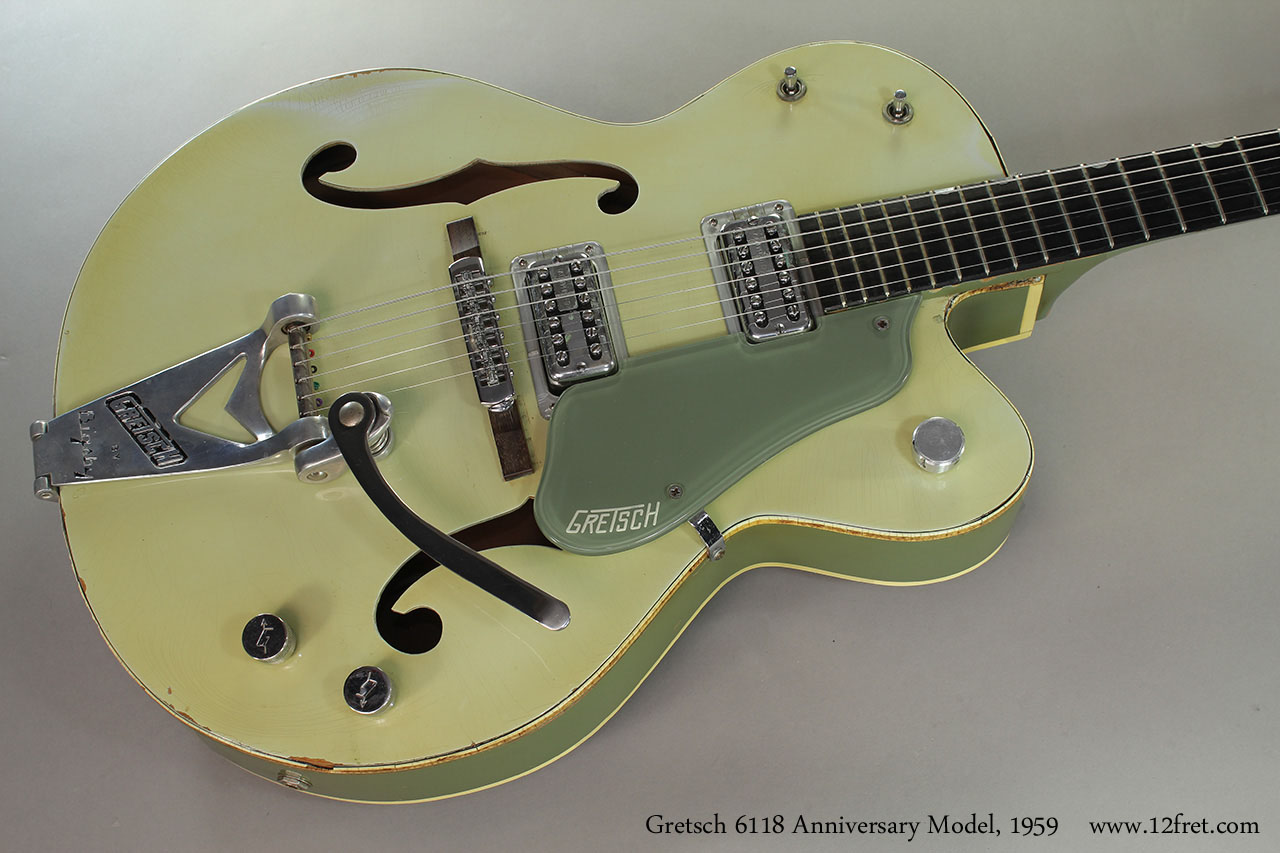 Both models used the same fully hollow, cutaway archtop body - at this point with trestle bracing for improved feedback rejection - made of maple laminates and a maple neck with ebony fingerboard. The Gretsch 6118 Anniversary differs from the Gretsch 6120 in the headstock shape, an unbound headstock and fingerboard, and some hardware. Some models of the Anniversary had only one pickup, and many did not have a Bigsby tailpiece.