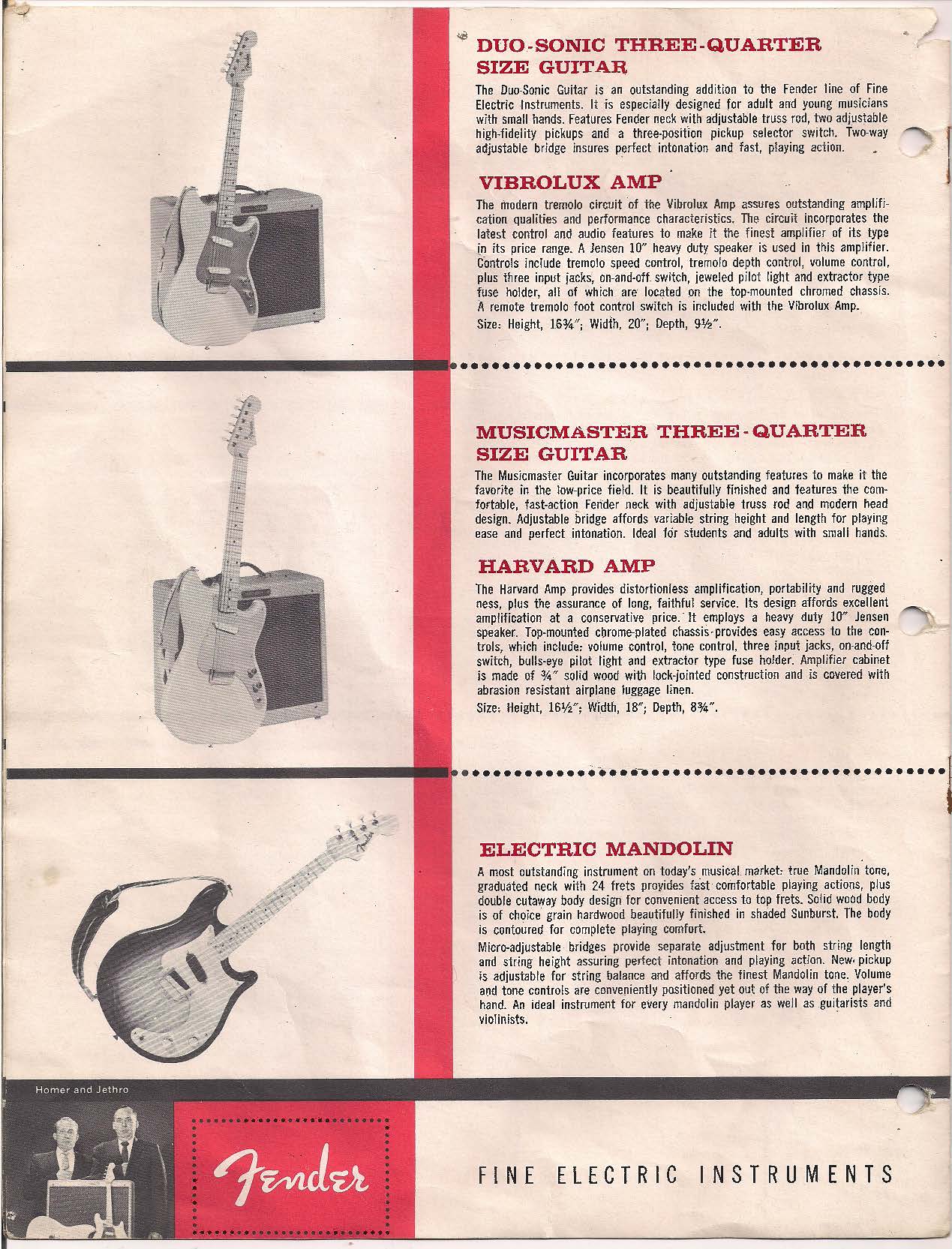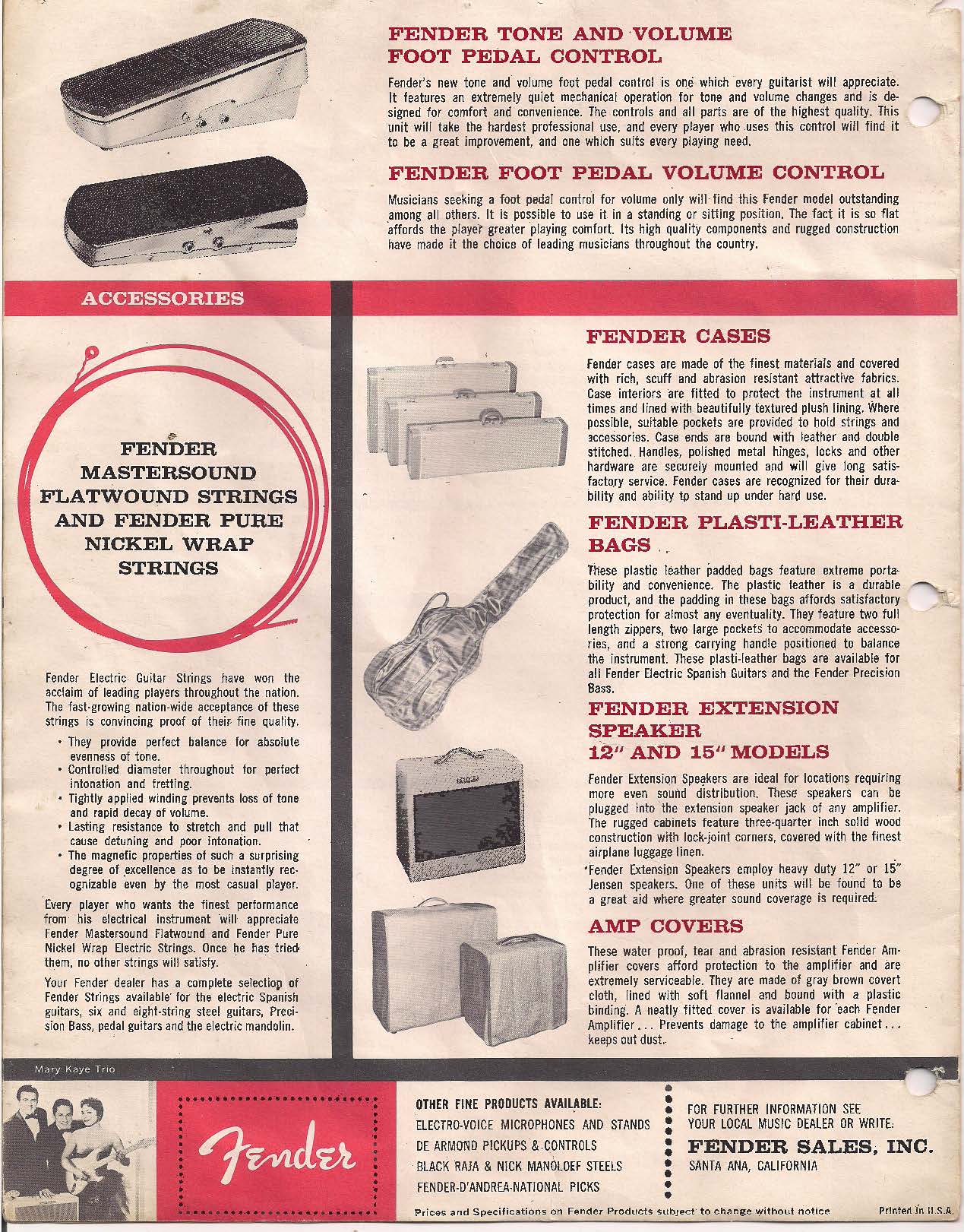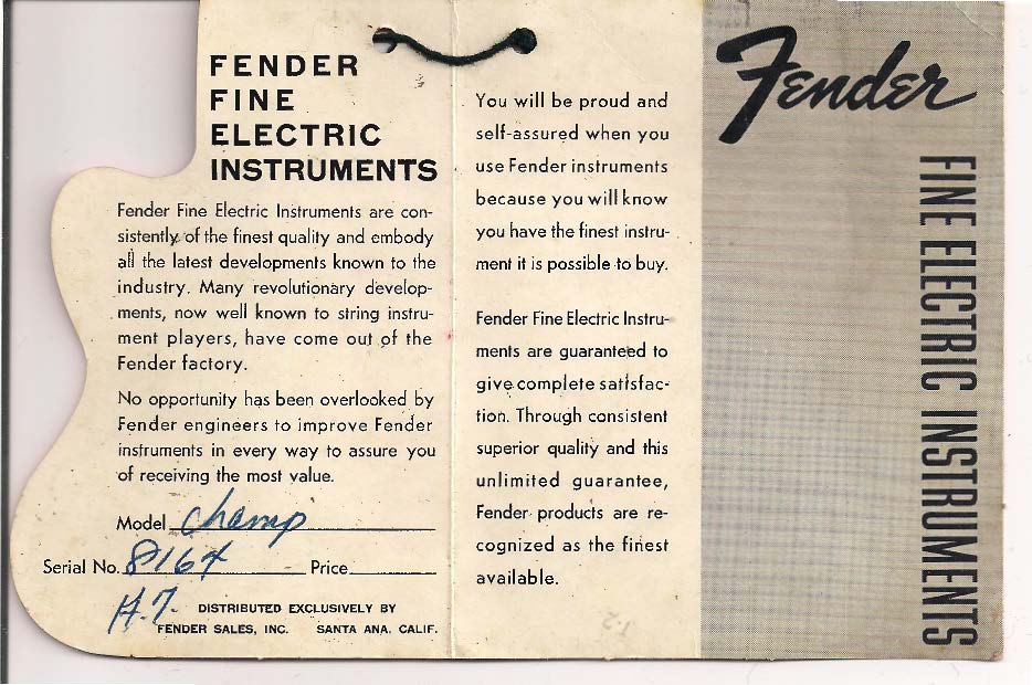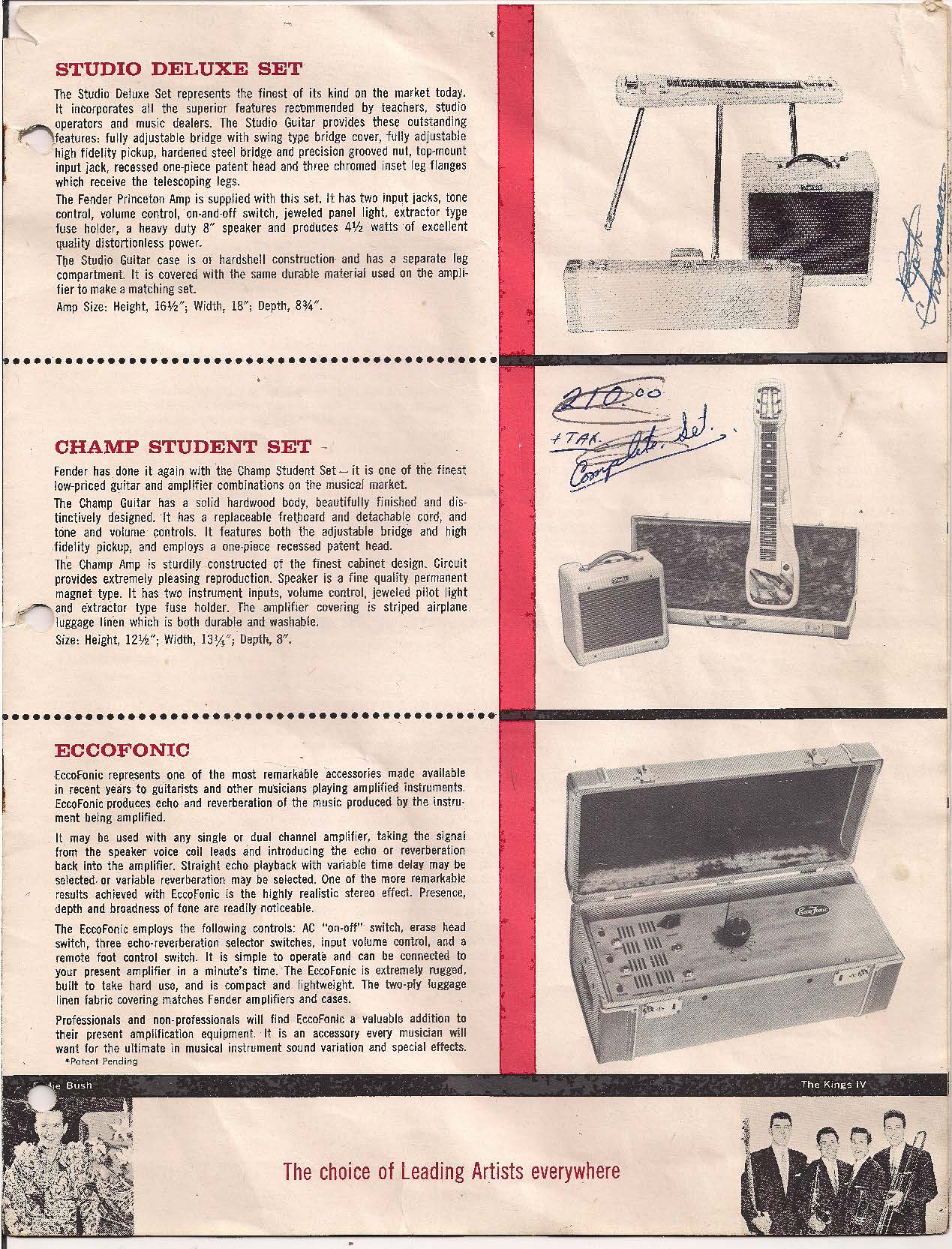 Also included are the original hang tags, the buisness card of the seller (Arthur H. Best of the Provincial Conservatory of Music in Peterborough), a 1962 Fender Electric Instruments catalog, the original cord, two Dobro brand clear fingerpicks, two steels, and the original Fender polishing cloth.