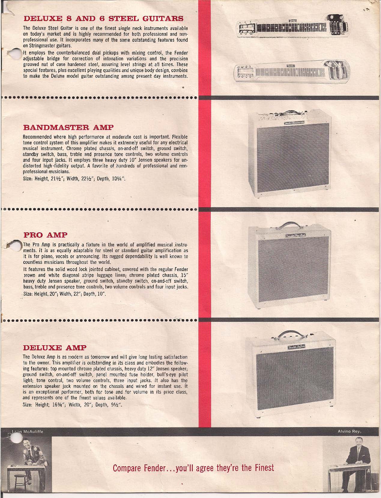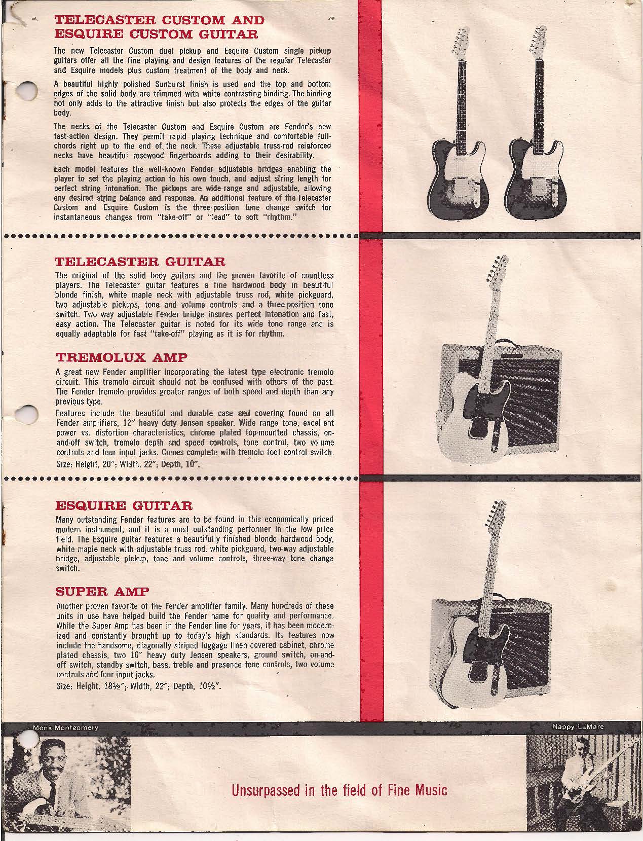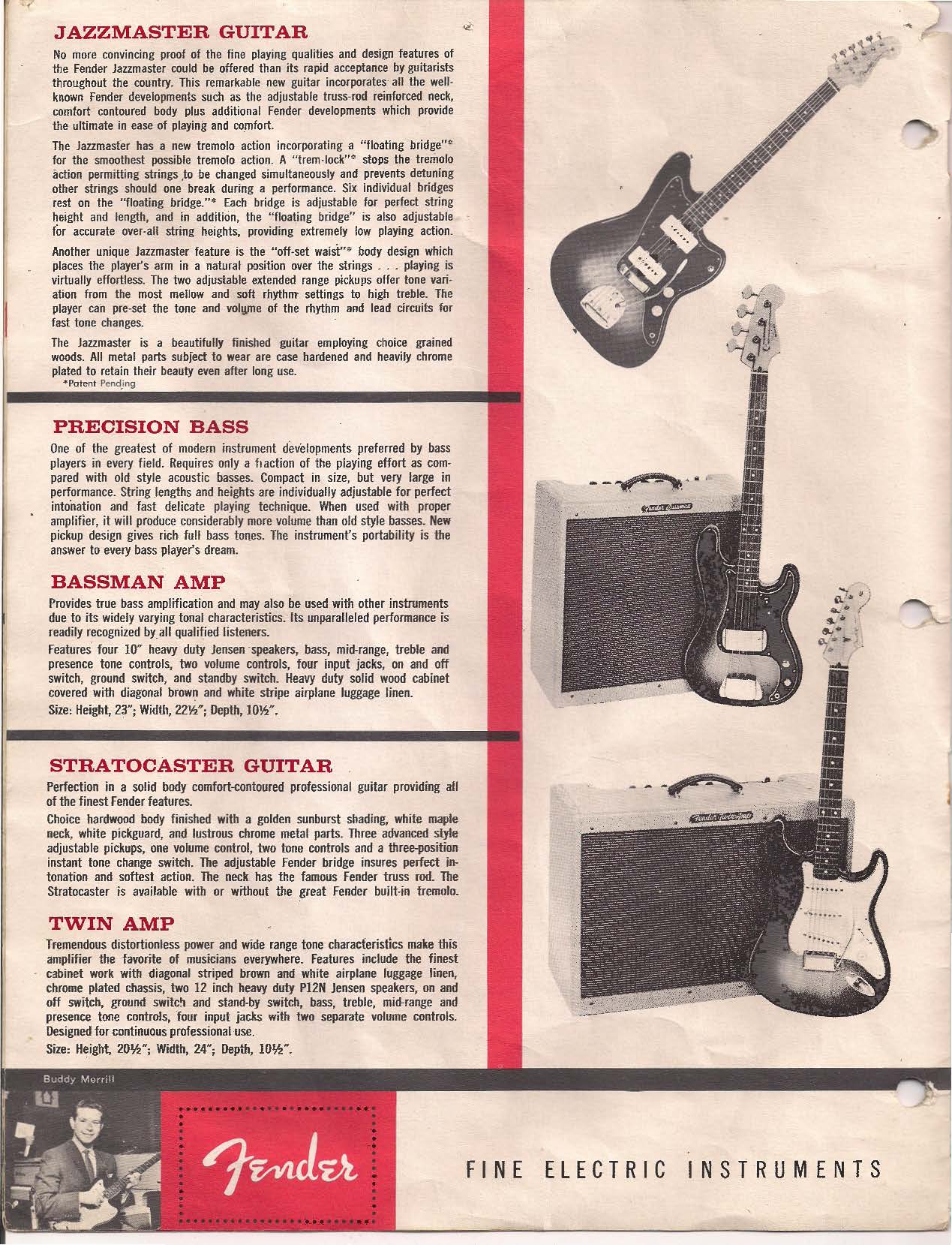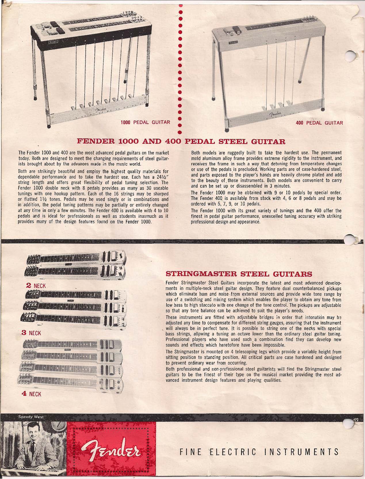 Also included are the original hang tags, the buisness card of the seller (Arthur H. Best of the Provincial Conservatory of Music in Peterborough), a 1962 Fender Electric Instruments catalog, the original cord, two Dobro brand clear fingerpicks, two steels, and the original Fender polishing cloth.