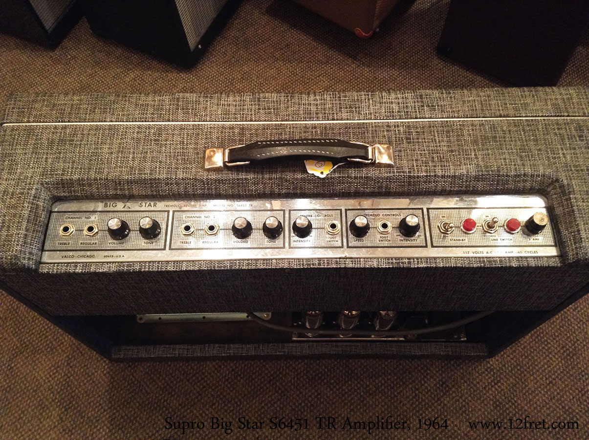 The Supro Big Star S6541 TR amp was built in 1964. A combo amp with two 12-inch speakers, the Big Star featured tremolo and reverb - hence the TR designation - plus 35 watts, with the preamp on the top chassis and the power section on the bottom of the amp along with the reverb tank.