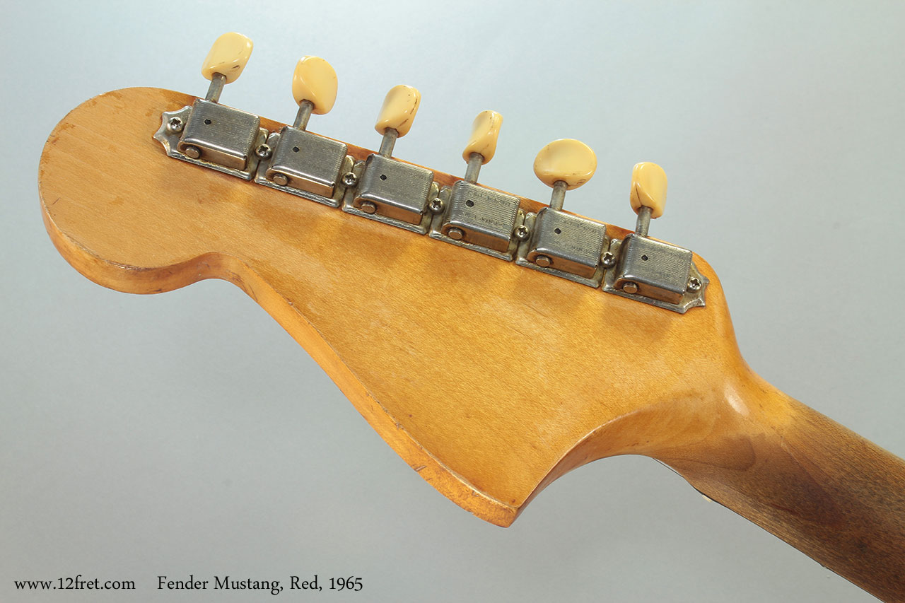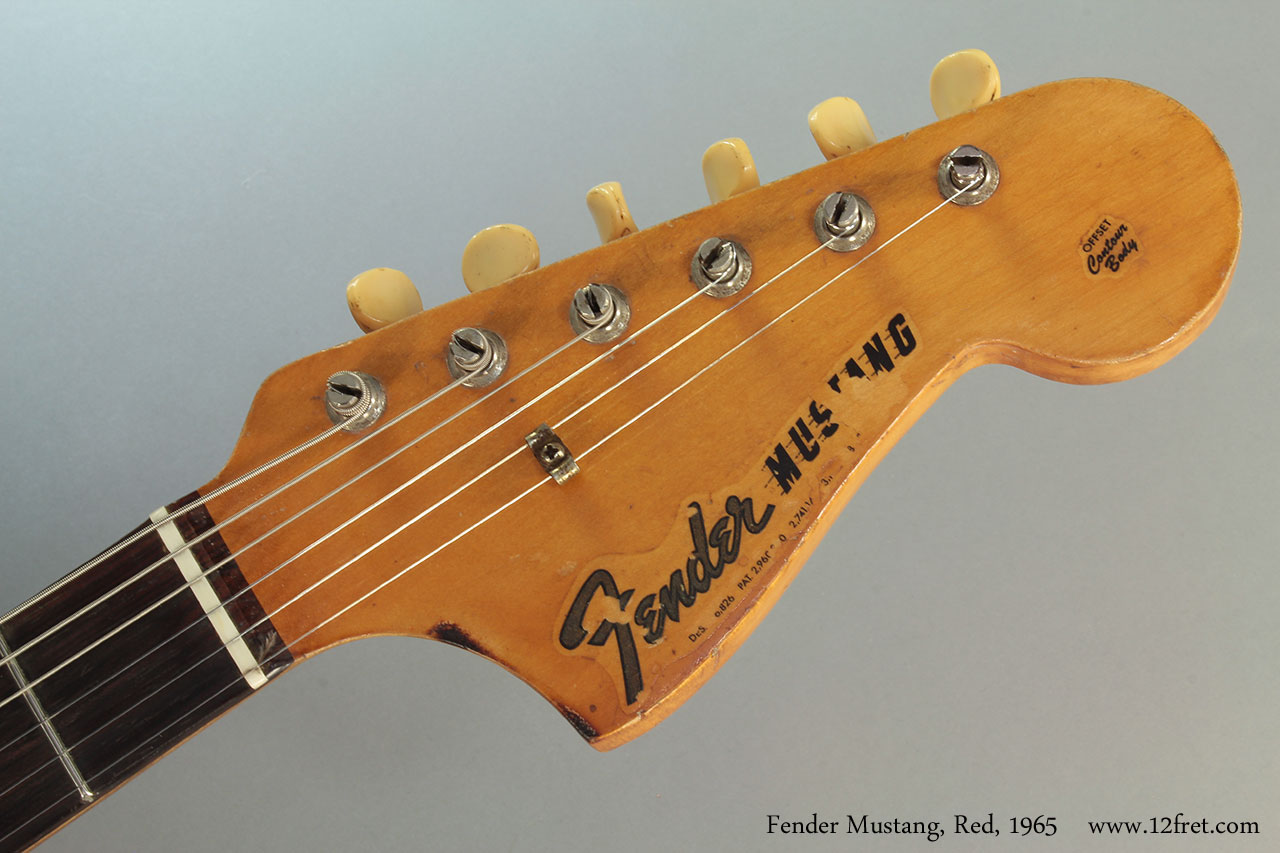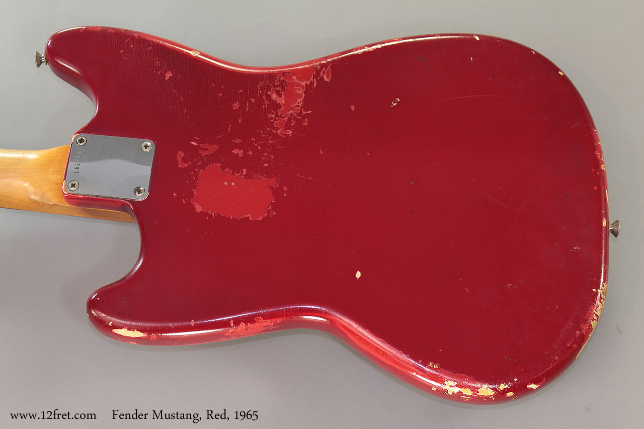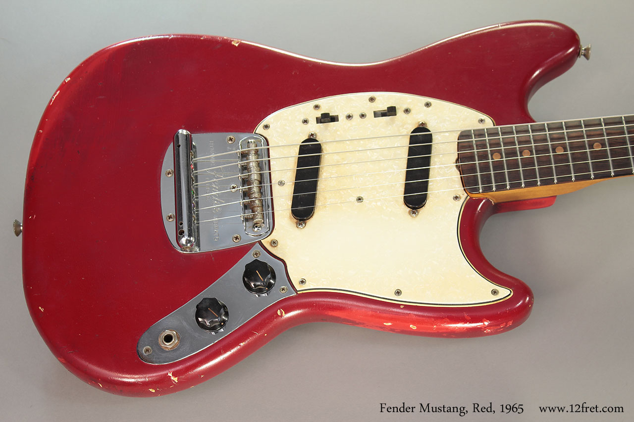 This 1965 Fender Mustang is finished in red - and may have been finished in red twice. It looks like a Dakota Red colour was applied over a Fiesta Red layer. As the top Dakota coat has worn, the brighter Fiesta layer is seen. The hardware appears to be largely original. The control pots date to 1964, and the neck dates to 1965. It has been professionally refretted and had a bone nut added, so it plays well. The original silver/grey hardshell case is included.