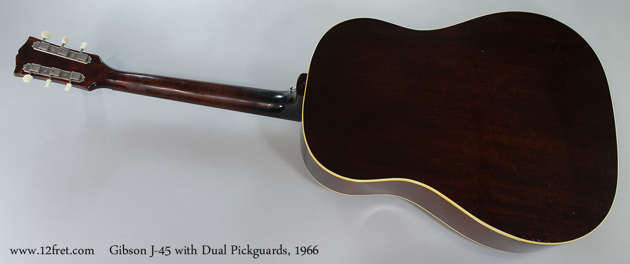 This 1966 Gibson J-45 comes with an fairly unusual option - factory installed dual pickguards. The original adjustable bridge has been replaced with a rosewood fixed-saddle model. The Kluson strip tuners are original. The sunburst finish is in good original condition with the expected natural lacquer checking. The original case is included.
