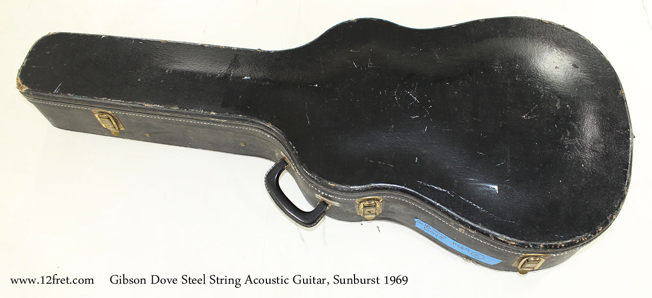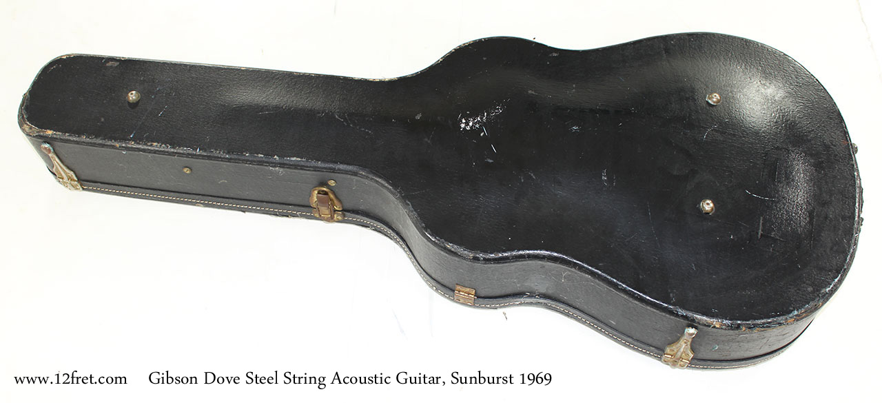 Featuring a full size, squared dreadnought body with spruce top paired with maple for the back and sides, mahogany for the neck, and rosewood, originally Brazilian, for the fingerboard, the Gibson Dove also sported an oversize bridge with a pair of mother of pearl doves, and another mother of pearl dove inlaid on the translucent, hand-painted pickguard. The maple used in the back and sides provide a brighter tone than mahogany or rosewood. In 1968, the bracing was strengthened, which improved reliability but reduced volume. As well, pickguards for the next while were sometimes screwed to the top as is the case on this guitar. These features add, in the words of some Gibson reps, 'natural compression'; and while that term sounds odd, the practical effect can be of significant help in a recording situation.