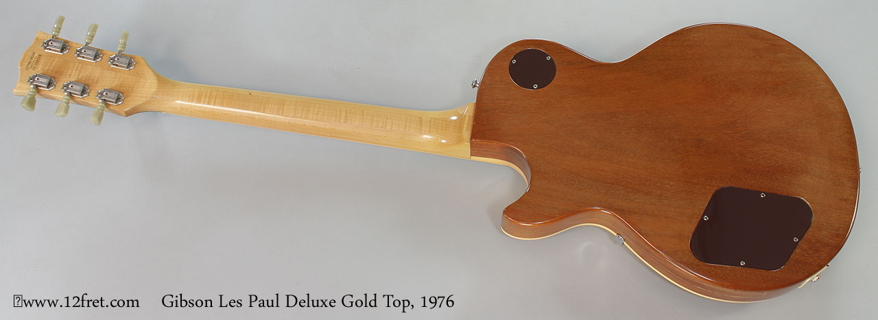 This Gibson Les Paul Deluxe dates to 1976. The serial number by itself can be a bit ambiguous - the same number would appear 30 years later on a guitar built in 2006. Firm dating is determined from the pancake body, which was used from 1969 to 1976, and the serial number being part of a decal on the back of the head. Starting in 1977, serial numbers were stamped into the back of the head. At this period, the necks are 3 pieces and made of maple with rosewood fingerboards.
