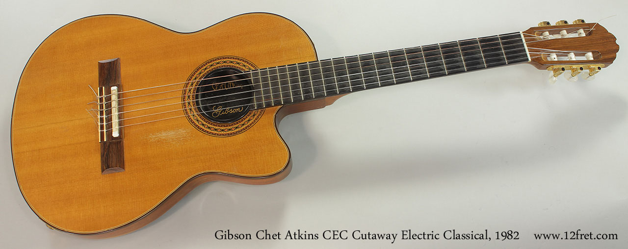 In the late 1970's, Chet Atkins apparently approached Gibson with a prototype of a solidbody nylon string guitar. By this time Chet was frequently performing with nylon string guitars and these are problematic at stage volumes. The Gibson Chet Atkins CE and Gibson Chet Atkins CEC appeared in 1981, with the difference in fingerboard targeting those who were coming from a steel-string background (and wanted a narrower fingerboard) and those coming from a classical background.