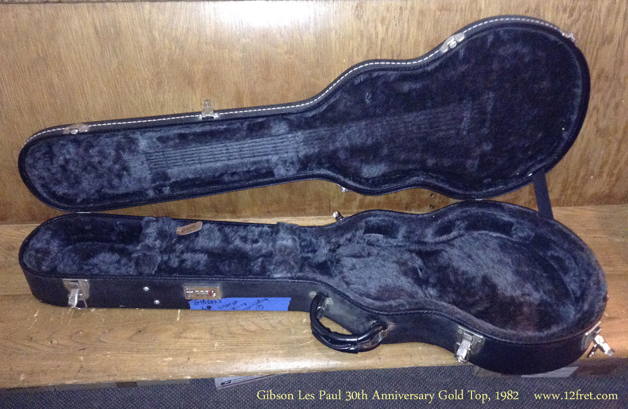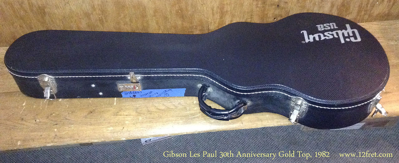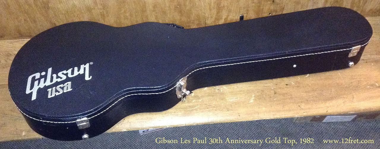 The finish features a light-coloured filler on the mahogany, and the gold top is a bit darker than modern renderings. The hardware is nickel plated. This guitar is now 34 years old, and has been played so there is some finish wear and a few dents and scuffs around the edges. Fretwear is light to moderate, with some of the expected binding cracking at the fret slots. Overall, this guitar plays well and sounds great. A Gibson hardshell case is included.