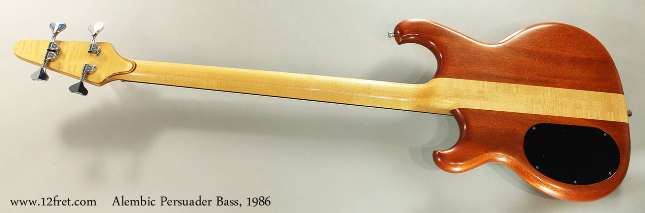 The Alembic Persuader bass was built from 1983 to 1991, and features the typical Alembic neck-through-body construction. The body is mahogany with a quilted maple top, the neck is 3-piece maple with an ebony fingerboard. The tuners are Schaller mini-body units. The rest is Alembic, with brass nut, bridge and tailpiece and an Alembic P/J2 AE-1 pickup set with volume, tone, and tone filter controls.