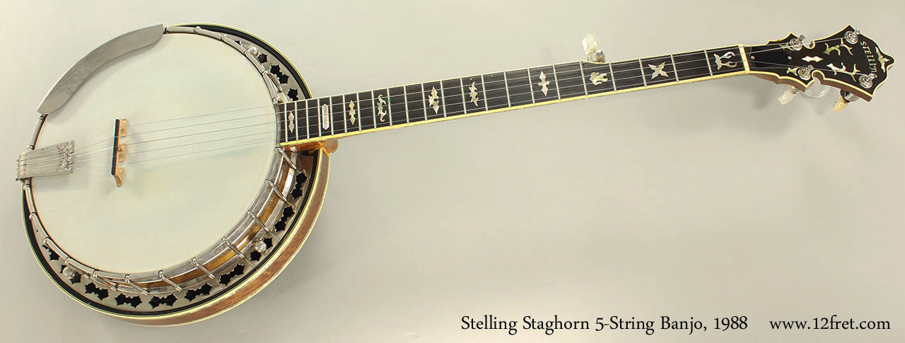 Since 1975, the Stelling Staghorn has been the flagship instrument from the Stelling Banjo Works in Afton, Virginia, featuring rare materials like highly figured Claro (California Black) Walnut and Abalone. Currently, the new price for a Stelling Staghorn exceeds $8400 US!
