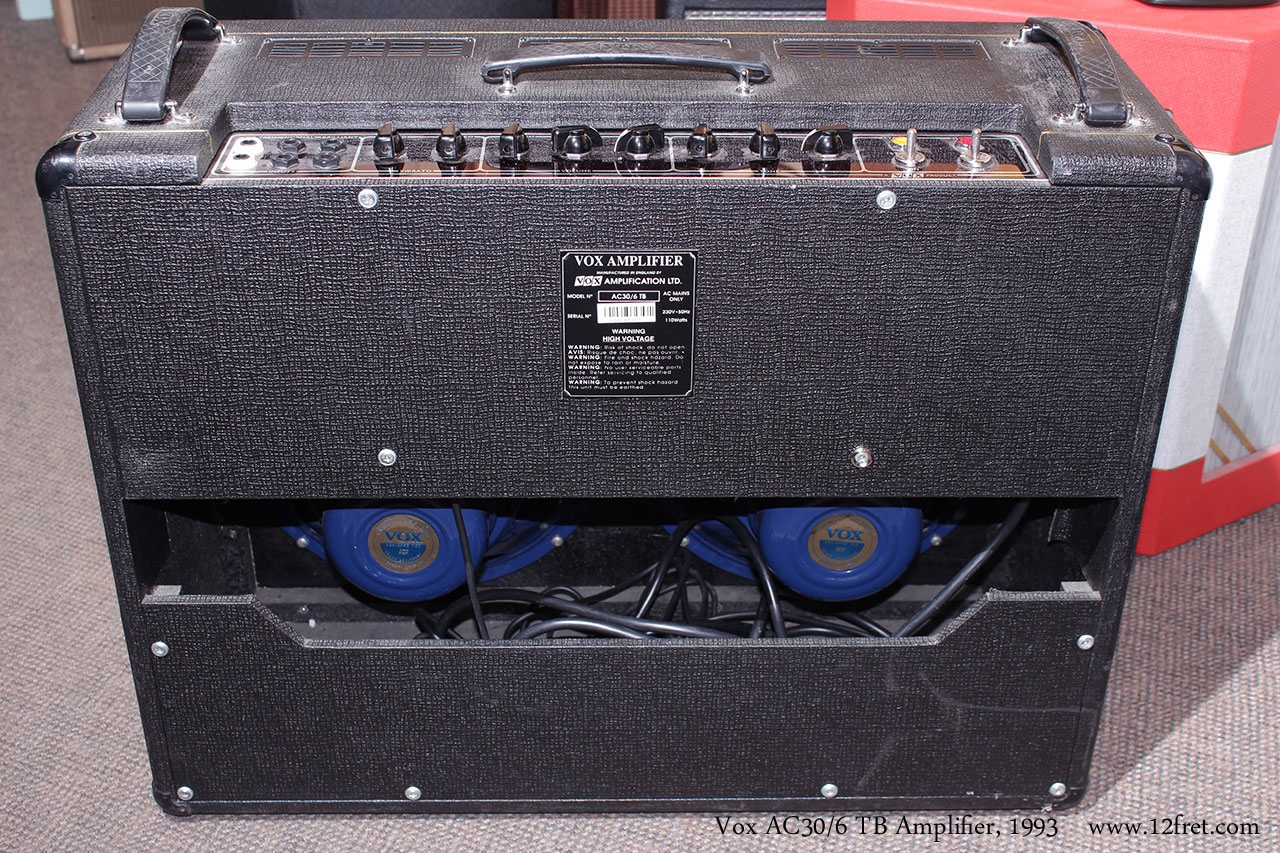 Here we're looking at a 1993 Vox AC30/6 TB model, built in England. The 1993 date is based on the first two digits of the serial number. The 12 inch speakers are blue Vox designs, built by Celestion.