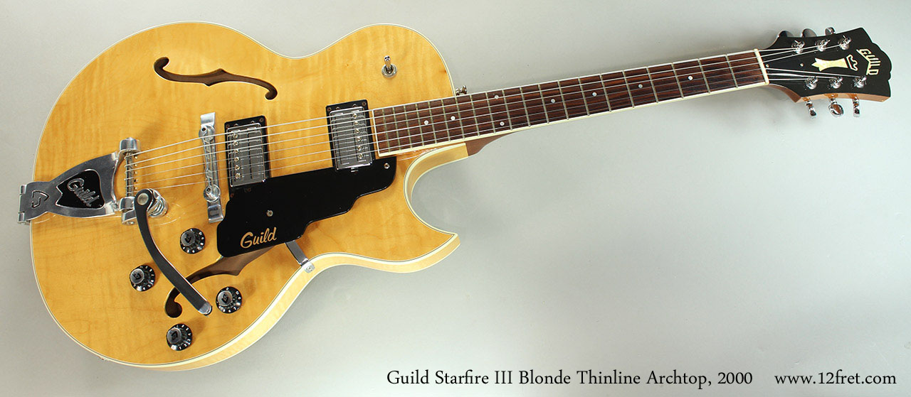 This example of the Starfire III Blonde dates to 2000 and was built in Westerly, Rhode Island. The body is nicely figured 3-ply maple laminate, the neck is mahogany and the fingerboard rosewood. A pair of Guild humbuckers (at this point built by Seymour Duncan) are installed, Grover Roto-Matic tuners are at the head, and at the other end there's a Guild-branded Bigsby B3 and Bigsby aluminum bridge.