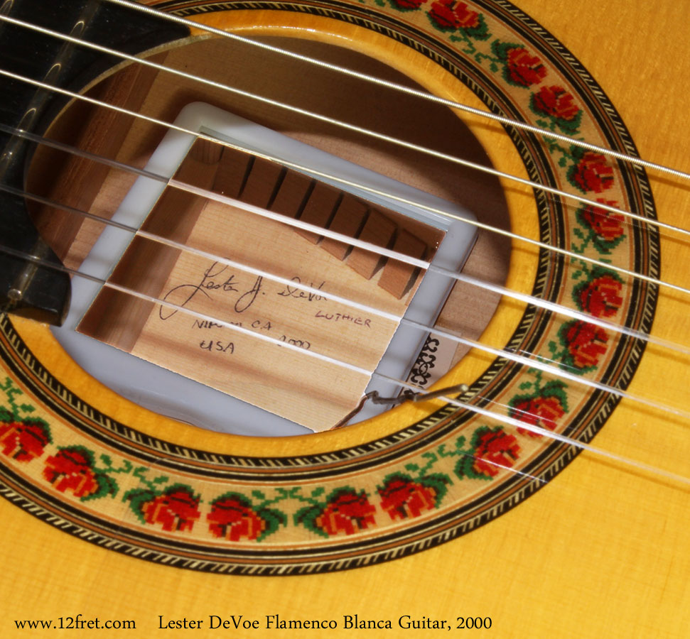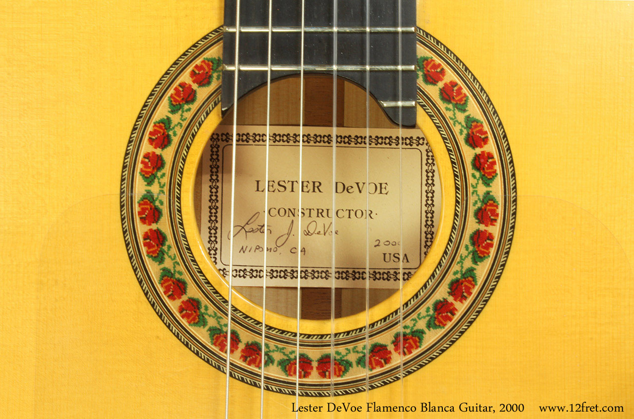 This DeVoe Flamenco Blanca guitar was built in Lester DeVoe's shop in Nipomo, California during 2000. It features a European Spruce top, Cypress back and sides, Spanish Cedar for the neck and ebony for the fingerboard and bridge. The top features a rose pattern rosette, and the body and neck are joined in the traditional Spanish style.