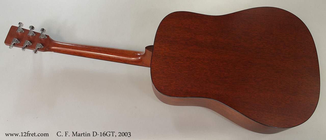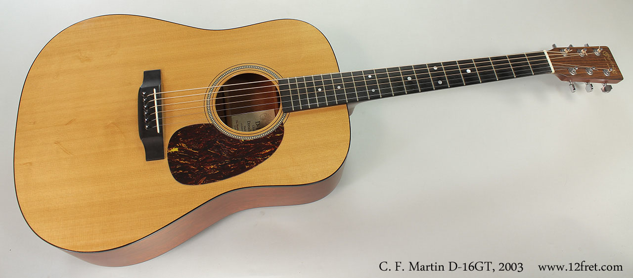 Based on the concept of the iconic C. F. Martin D-18, the Martin D-16GT features solid wood construction: Sitka spruce top, mahogany back, sides and neck. The fingerboard and bridge are Richlite, a composite material with the look and feel of ebony that Martin has been using for some time. As stock, this guitar carried a gloss finish top and satin for the rest of the guitar.