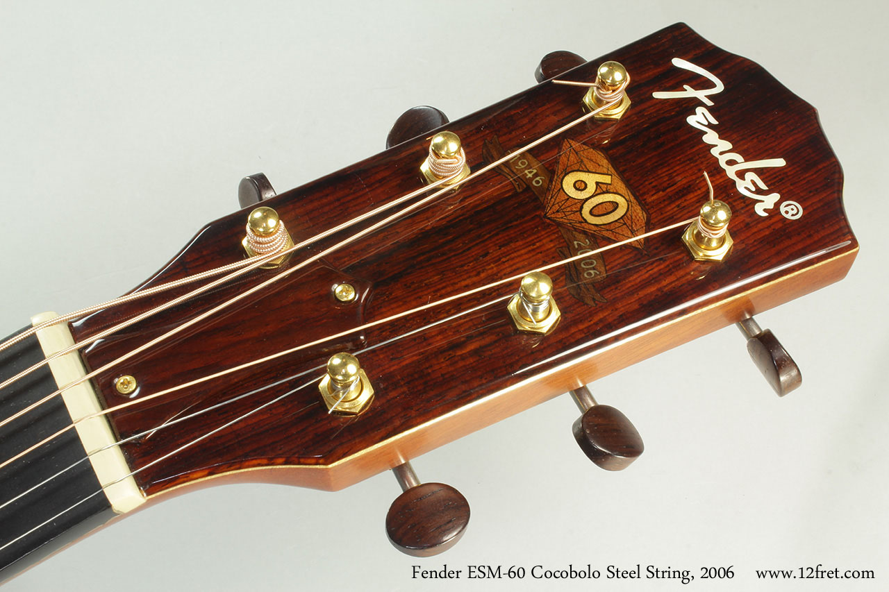 The Fender ESM-60 was a very limited production guitar, with apparently 68 built during 2006. Production was in Ensenada, Mexico. The body is a mini-jumbo, with all solid woods; Spruce for the top, Cocobolo for the back and sides, mahogany for the neck, ebony for the fingerboard and bridge. The trussrod cover is Palo Escrito, and the rosette is abalone. Scale length is 25.3 inches with a 1 11/16 inch nut width. A Fishman Ellupse VT pickup system is installed. The tuners are die-cast Waverly made, gold finish with cocobolo buttons. The finish is a durable polyester.
