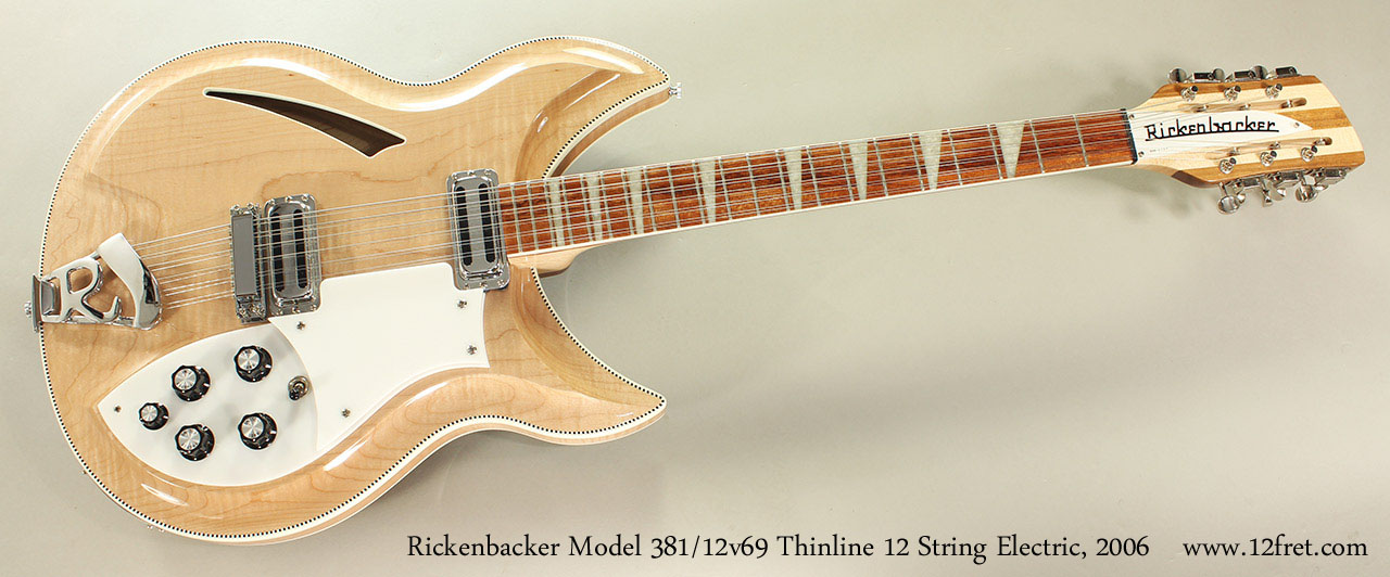 The Rickenbacker model 381 - 12 appeared in 1958, using a design by Roger Rossmeisl, who plays a key role in certain influential guitar designs. Featuring the thin, doublecutaway hollow body and trademark slash sound hole, the model 381 also has a hand-carved maple top and back. The usual unique Rickenbacker features such as standard mono and stereo outputs, staggered tuning machines, and dual-level pickguard are included.