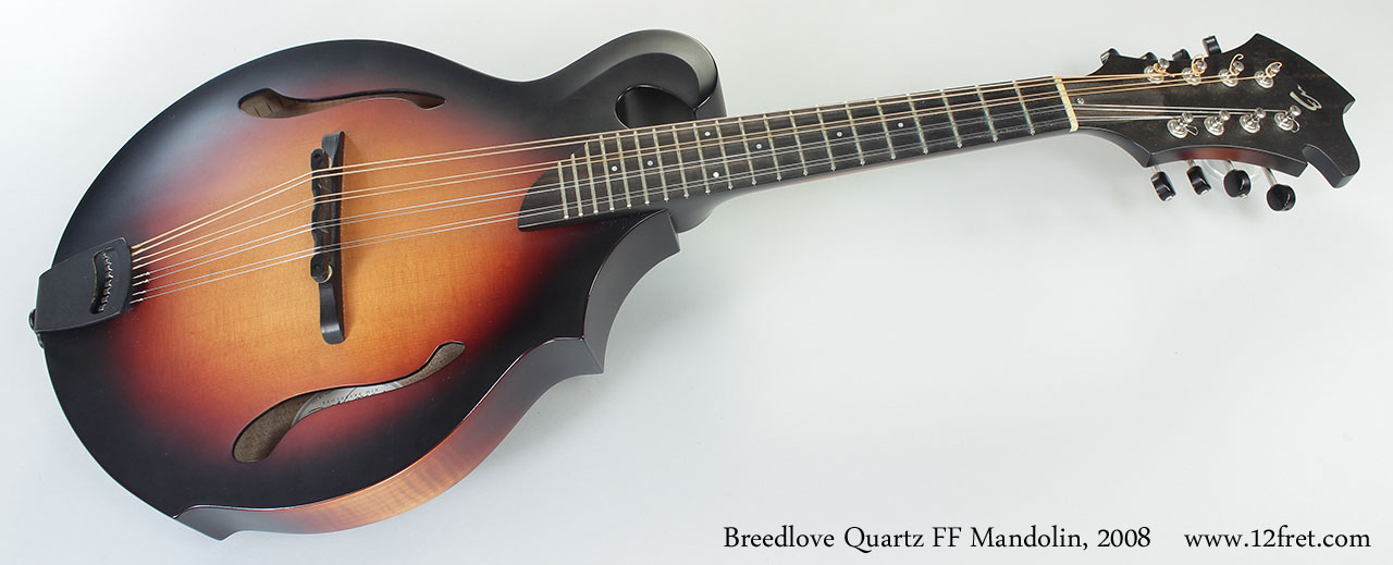 Here we have a 2008 Breedlove Quartz FF mandolin - this is an older model, and Breedlove has discontinued the Quartz name. The current equivalent F-style model, the Legacy FF, lists for $2,665.00 US.