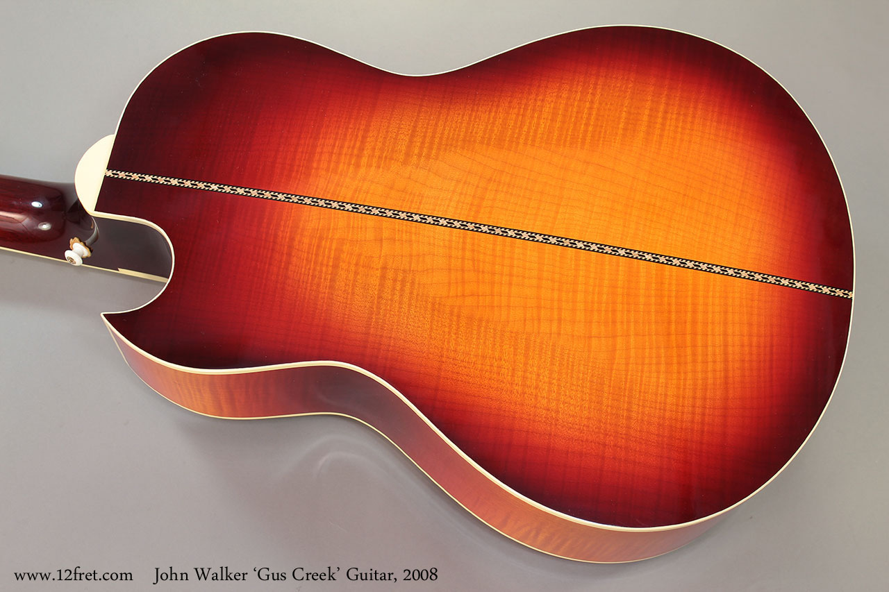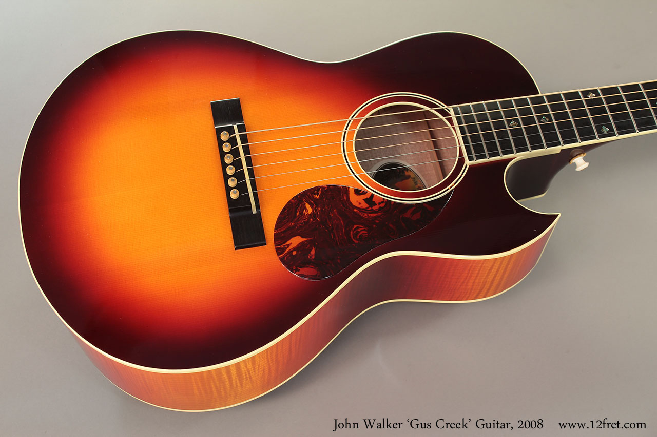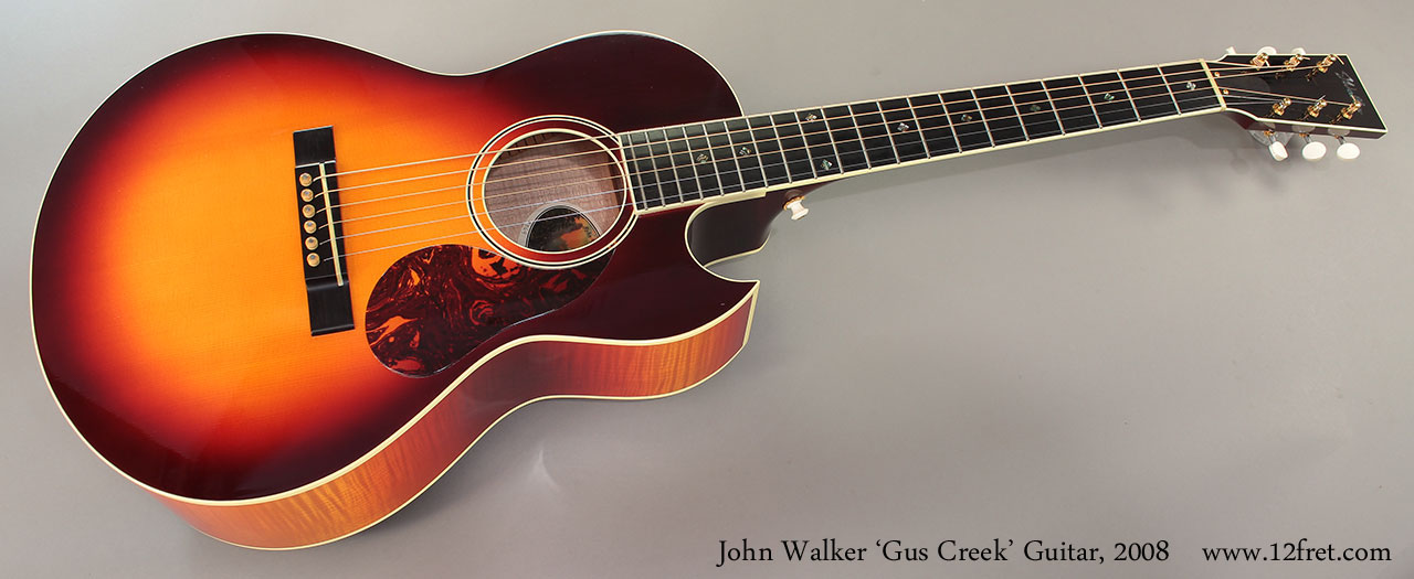 This 2008 John Walker Gus Creek Guitar is in excellent condition and is very well built. Featuring an Englemann spruce top, flame maple back and sides, mahogany neck and ebony for the fingerboard, headplate and bridge, this excellent instrument also has ivoroid binding, a complex zipper back strip, abalone inlays and gold Waverly tuners.