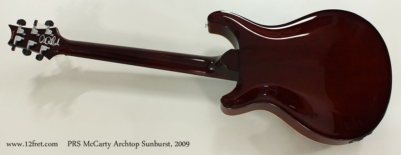 This sunburst PRS McCarty Archtop dates to 2009 and based on its serial number was likely built in the first part of January. It has a 'wide fat' neck, and the original Archtop pickups were replaced with 57/08 pickups (the originals are in the case) and coil tap switches were added. This work was done at PRS. There is also a piezo pickup in the bridge, and there's a separate output for it and the battery access for its preamp on the jack plate. The back of the headstock carries a Paul Reed Smith signature.