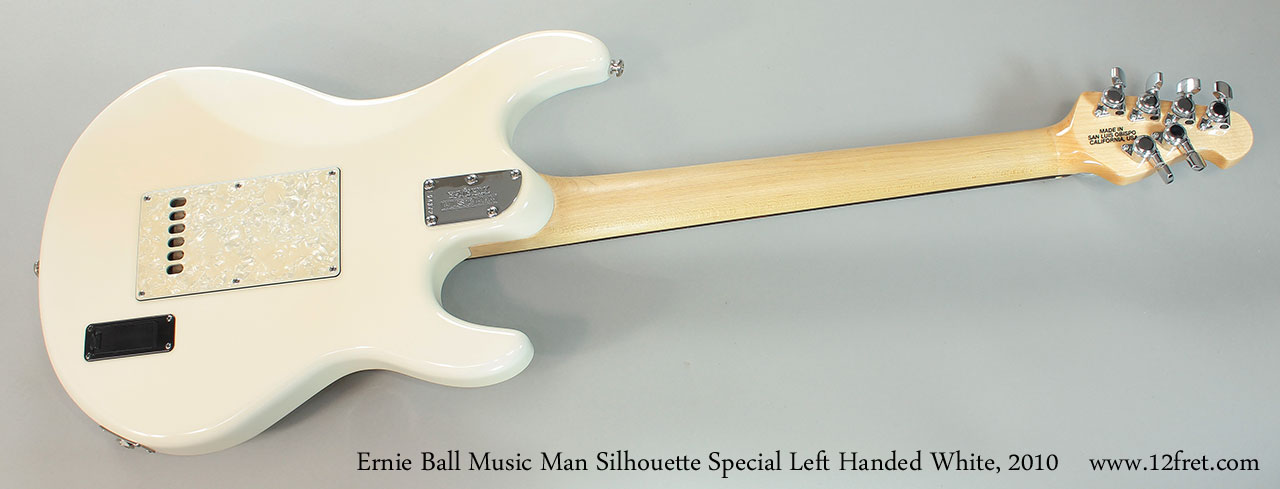 This left handed Ernie Ball Music Man Silhouette was built during 2010, sports a pearl white finish on the body and headstock, and is in excellent, all original condition. The body is basswood, and the neck is maple with a rosewood fingerboard. For hardware, it has locking tuners, a Music Man trem btridge, three single coil pickups - and of course, the silent circuit, which removes the 60-cycle hum single coils are so susceptible to. There is a 9v battery compartment on the back to power the silent circuit. The nut is compensated, something Music Man has been doing for quite some time. Fretwear is light - the guitar has been played but it has been very well cared for.