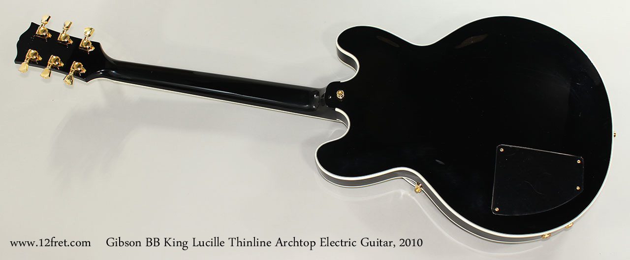 The Gibson BB King Lucille is based on the Gibson ES-355 design and appointments, so it has the full width, maple laminate thinline body in black finish with white binding, 3-piece maple neck with ebony fingerboard and mother of pearl block marker inlays, plus the B B King and crown inlay on the headstock and a brass truss rod cover with Lucille engraved. All the metal parts are gold plated, with Gibson 490R and 490T pickups and a Schaller fine-tuning tailpiece. Of course, it has the six-position Varitone circuit and is wired in Stereo - if desired, each pickup can go to a separate amplifier, or if used by itself the mono jack works in the normal fashion. It was B B King's practice to turn his amplifiers up all the way and control the volume from the guitar.
