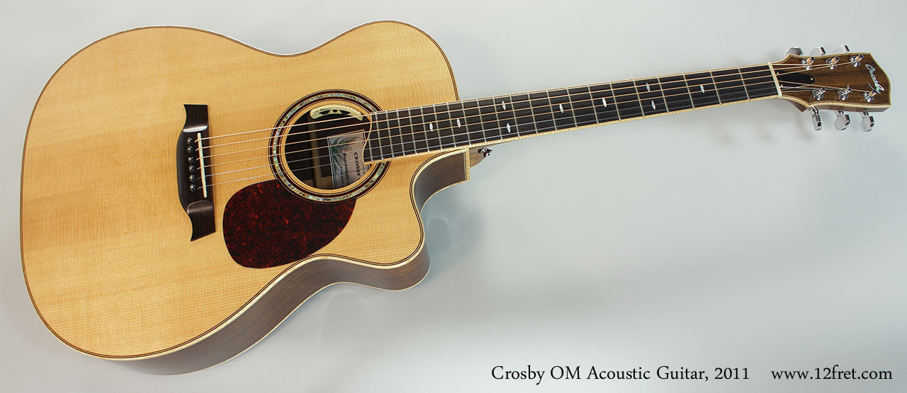 This Crosby OM with cutaway was built during 2011, and features a Sitka Spruce top with East Indian Rosewood back, sides and headplate and walnut for the neck. The fingerboard and bridge are Macassar Ebony, while the binding is curly maple. The roseette is made with cocobolo and green abalone.