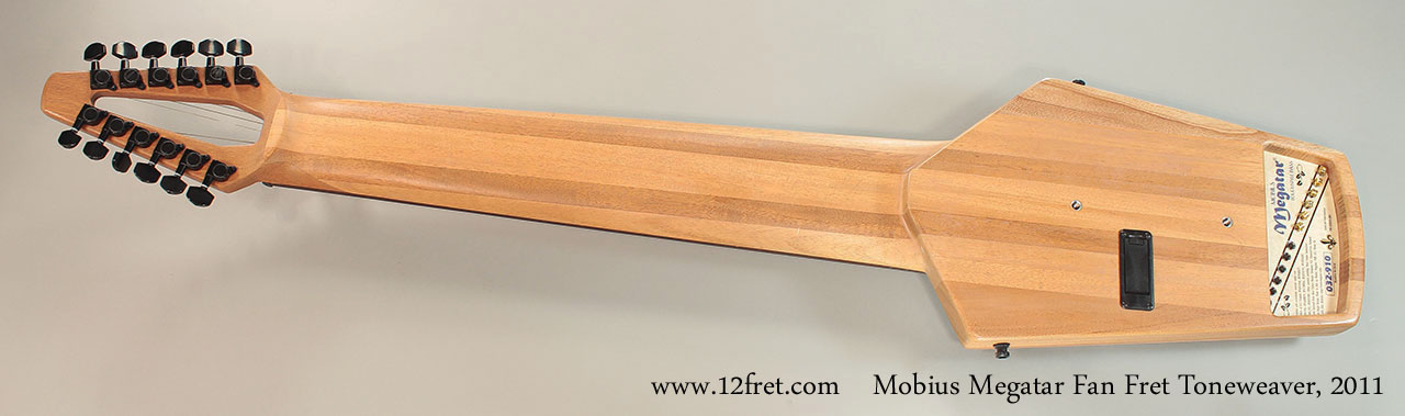 This is the top of the line Mobius Megatar - the Toneweaver model, licensing both Ralph Novak's Fanned Fret design and the Buzz Feiten offset intonation system. It has two Bartolini humbucking pickups, one for each set of strings, and each saddle has a piezo pickup element.