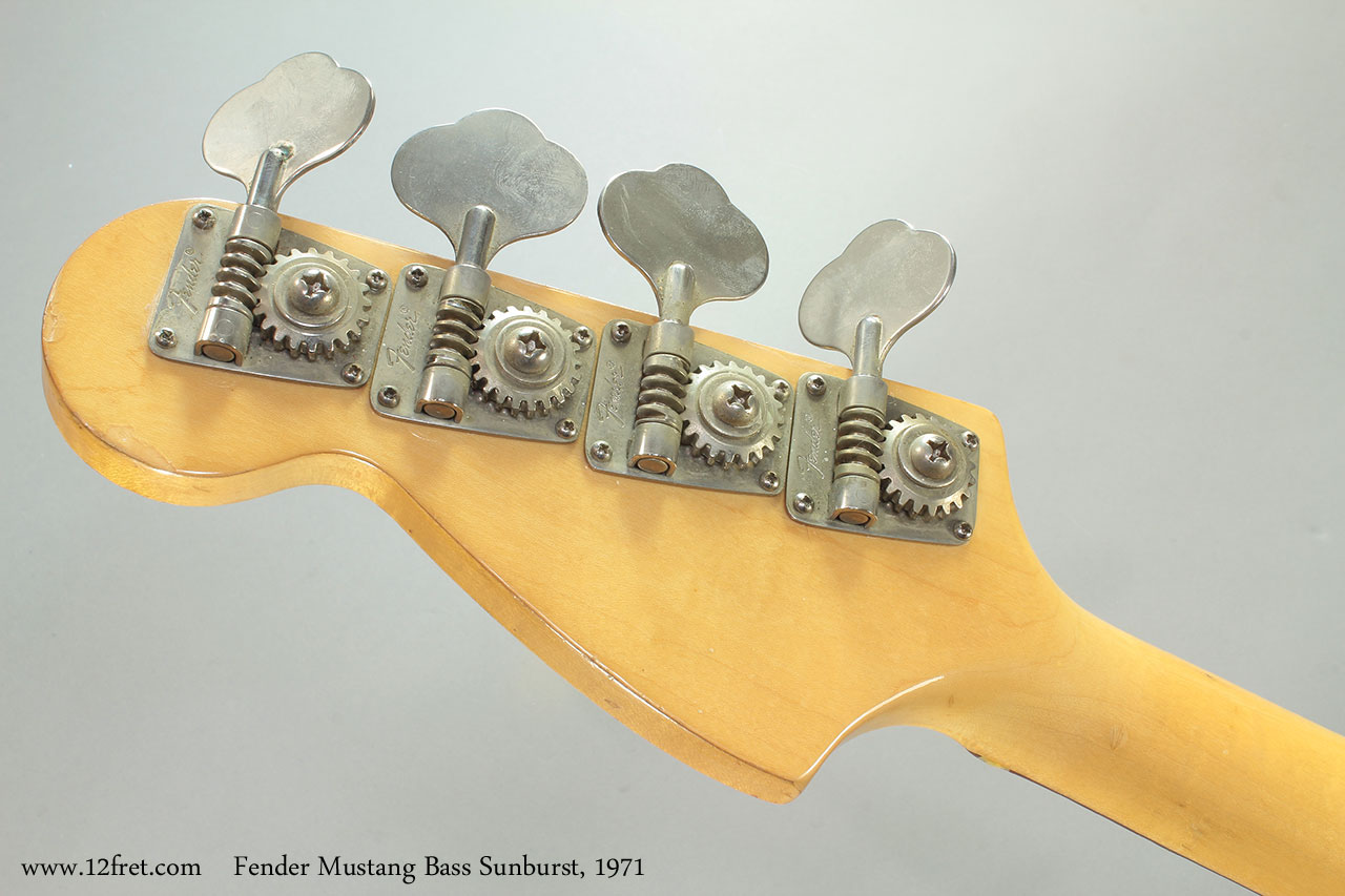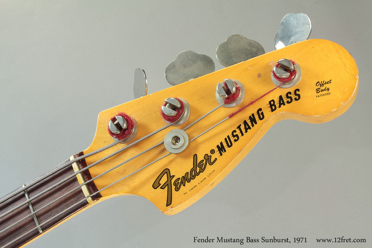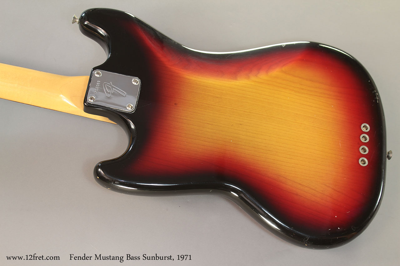 This 1971 Fender Mustang Bass features an ash body, rosewood fingerboard on a maple neck, a single split-coil pickup (so it is humbucking, like the Precision Bass pickup) and a sunburst finish.