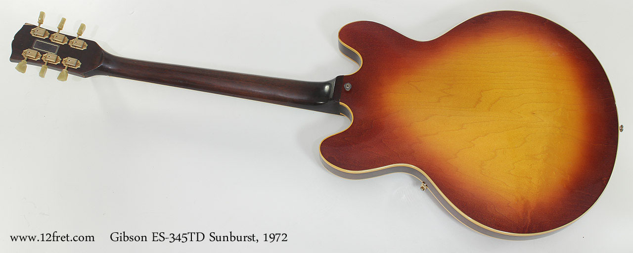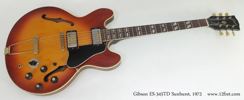 Gibson’s ES thinline series has been very popular since it was introduced in 1958. The Gibson ES-345TD is the ‘mid grade’ version – it has the fancier electronics with varitone and stereo wiring and gold plating, but not the extra binding, inlay and ebony fingerboard of the ES-355. To differentiate the neck from the ES-335, the ES-345 has split-parallelogram position markers.