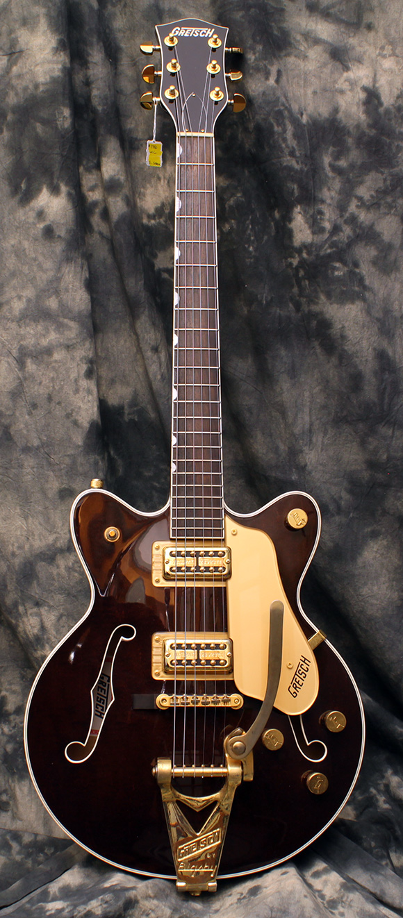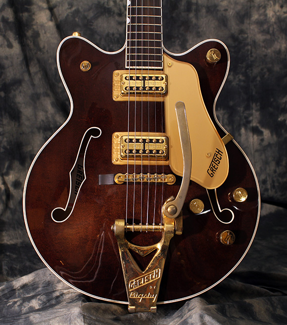 Hardware/electronics Gold hardware, G-brand tuners, V-cut Bigsby and adjustamatic bridge, dual Filter’trons, pickup switch, master volume, master tone, individual volumes controls.