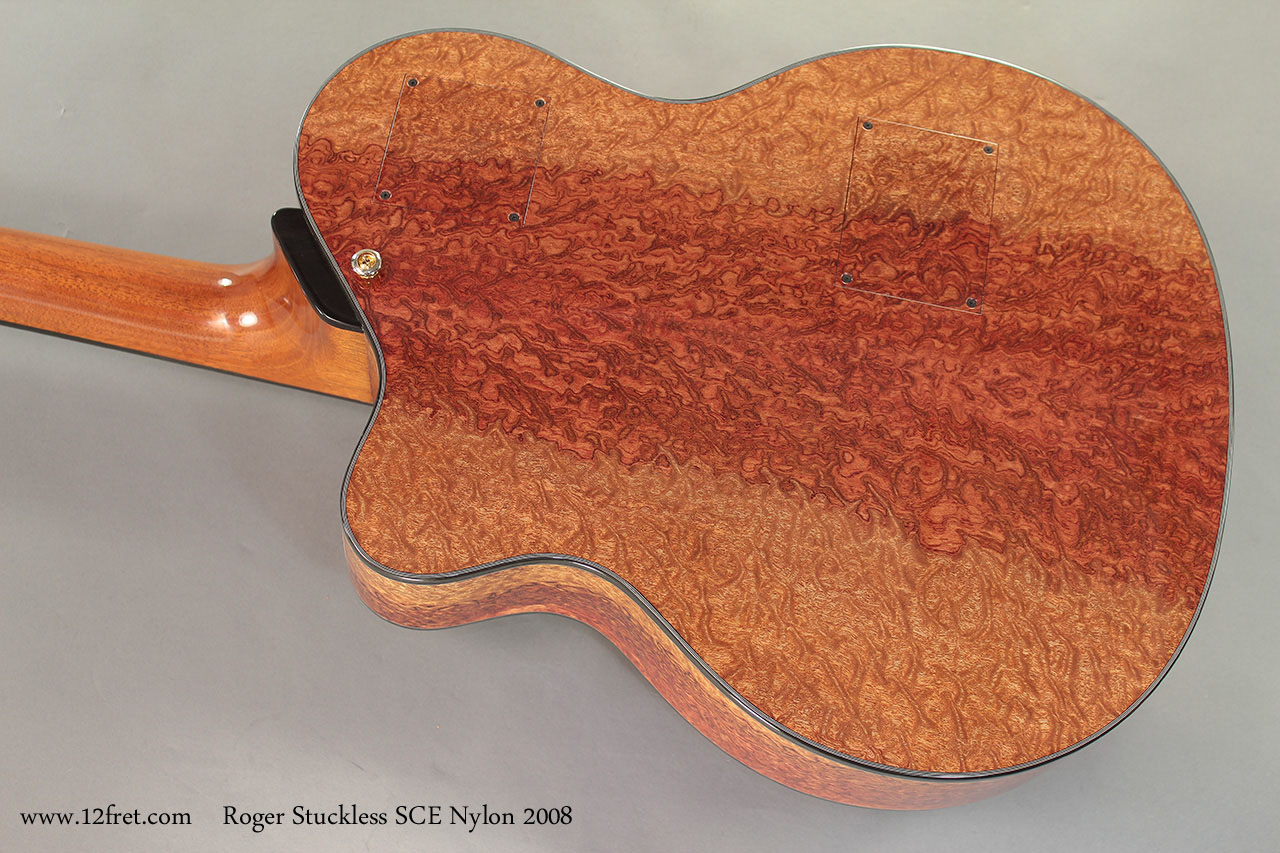 The Stuckless SCE is built as a crossover model, providing the tone and responsiveness of a classical guitar with the playability of a steel-string. The crossover concept is very popular with jazz, latin and country players, and it can be said with some accuracy that the first of the crossovers was the Gibson Chet Atkins CE solid-body classical. This nylon-string guitar has a scale length of 25.5 inches and 1.75 inch nut width, and a gentle fingerboard radius of around 16 inches.