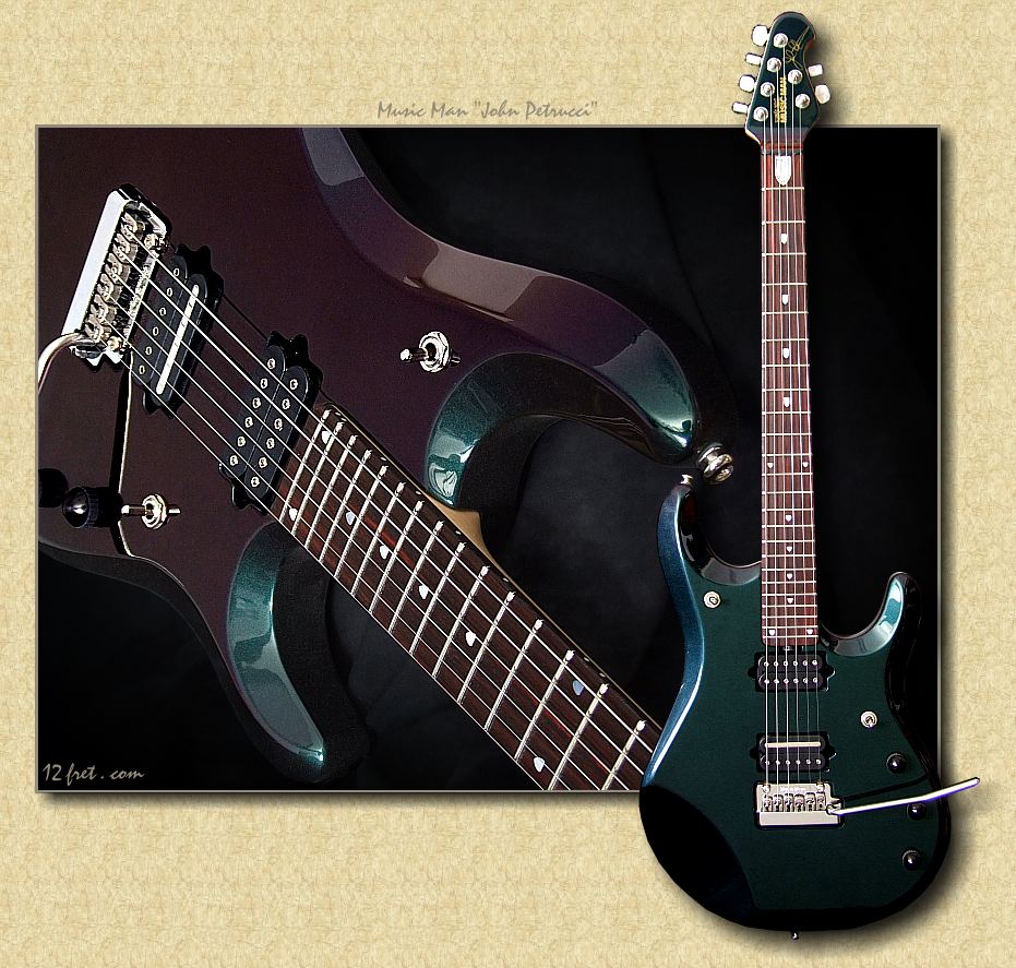 The Music Man Petrucci model was designed by the engineers at Ernie Ball in conjunction with John himself and includes a proprietary trem bridge with steel saddles, custom designed DiMarzio pickups, custom neck profile, locking tuners, 5-bolt never-shift neck joint; and unique arm channel contour to help anchor your picking arm The instrument that I’m reviewing today also features the cool Mystic Dream “flip-flop” finish that changes from deep emerald to a rich deep purple depending on the light refraction!